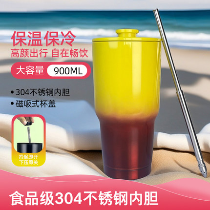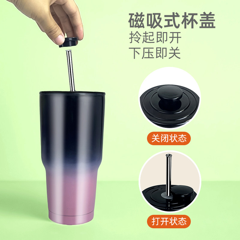 30OZ/900磁吸不锈钢自动伸缩吸管杯盖冰霸汽车史丹利保温保冷杯