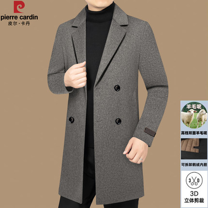 皮尔卡丹羊毛呢大衣男中长款西装领双排扣双面呢冬季加厚风衣外套