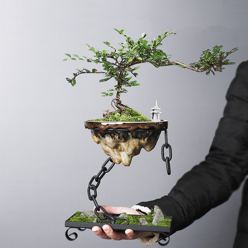 中式铁艺悬挂式创意植物盆栽禅意摆件文竹铁树铁链悬浮微景观盆景