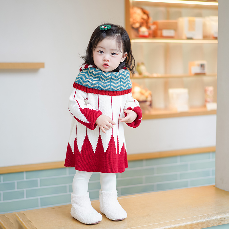 小蜜糖童装女童斗篷秋冬儿童圣诞服装红色宝宝毛衣连帽圣诞节衣服