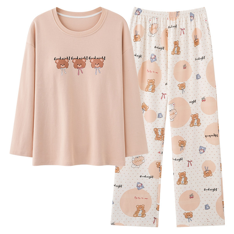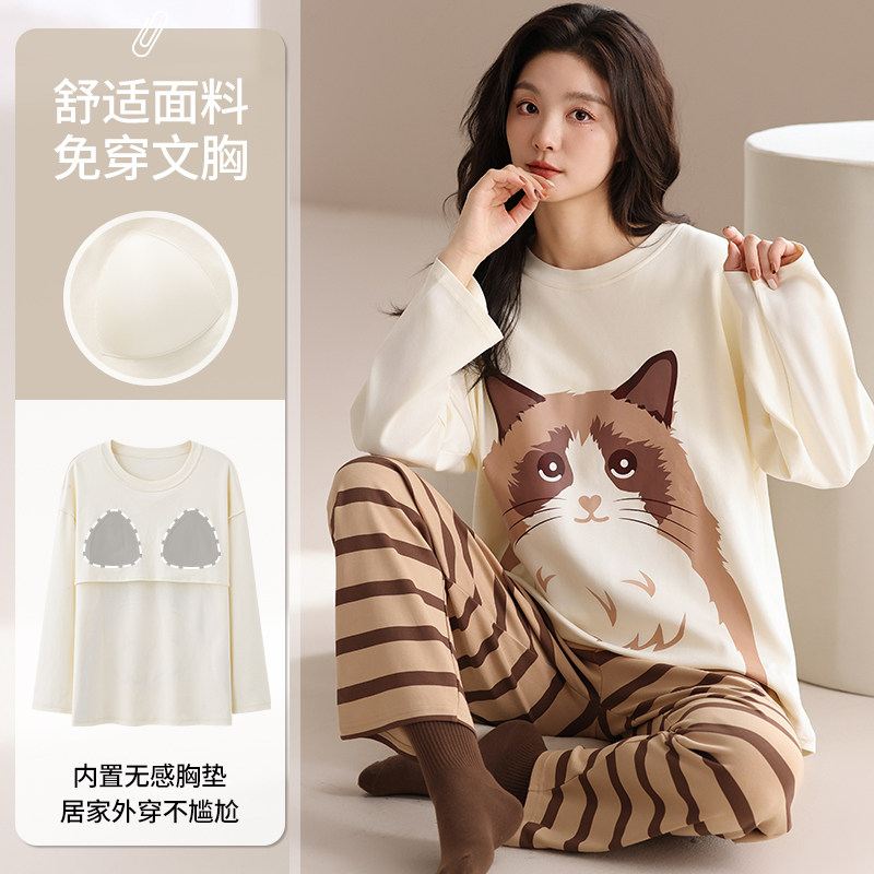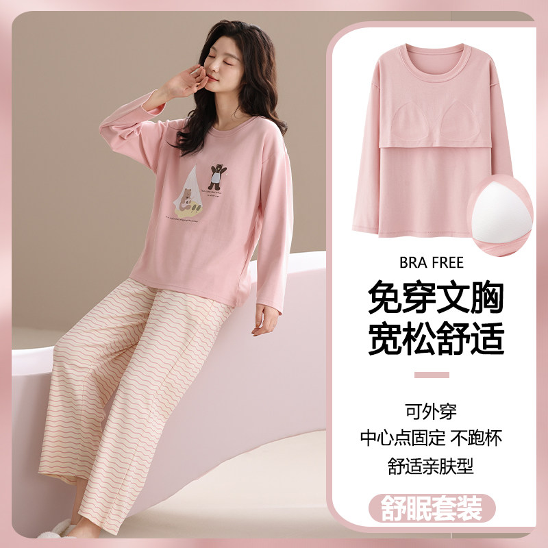 2025新款纯棉睡衣女春秋季带胸垫一体长袖学生可爱卡通小熊家居服