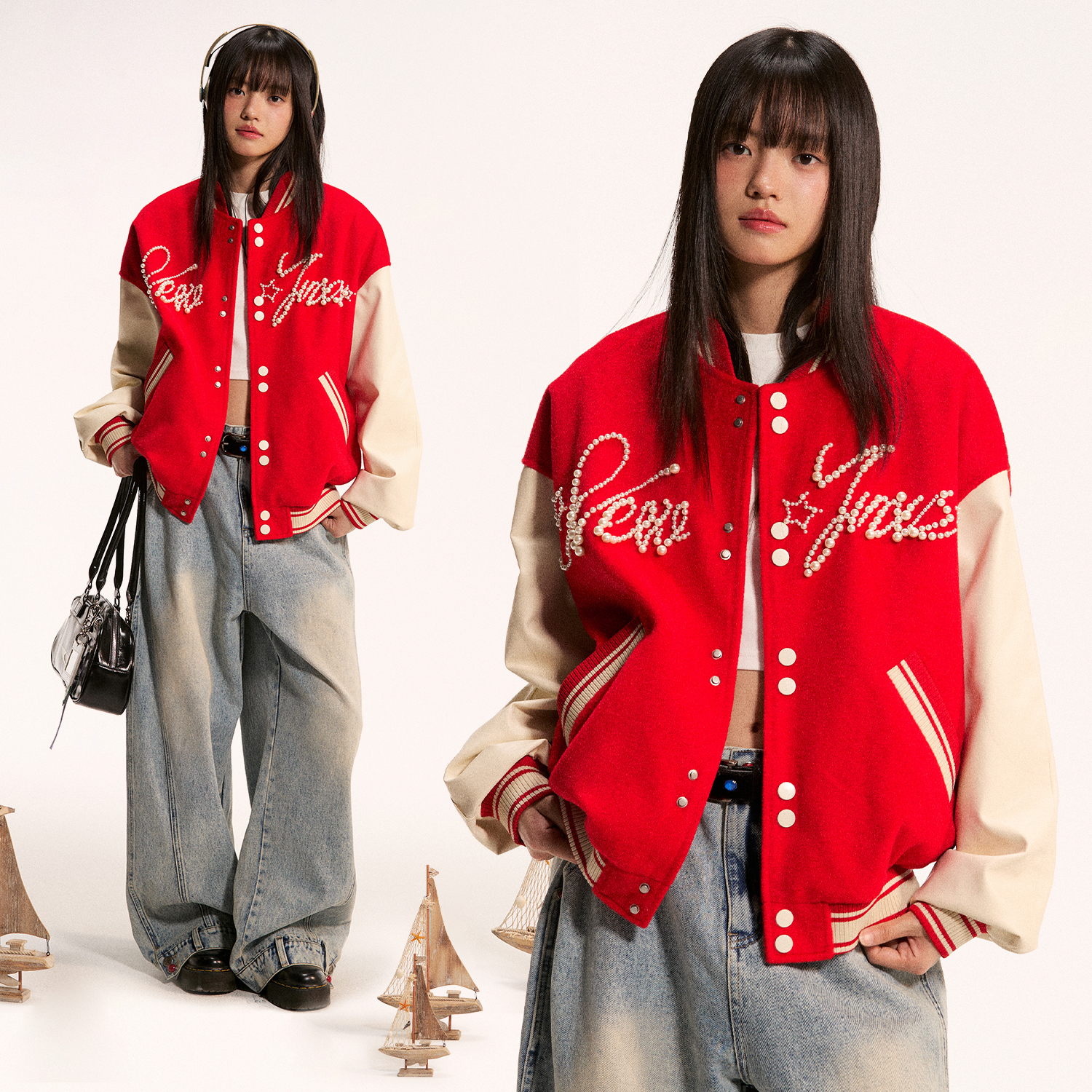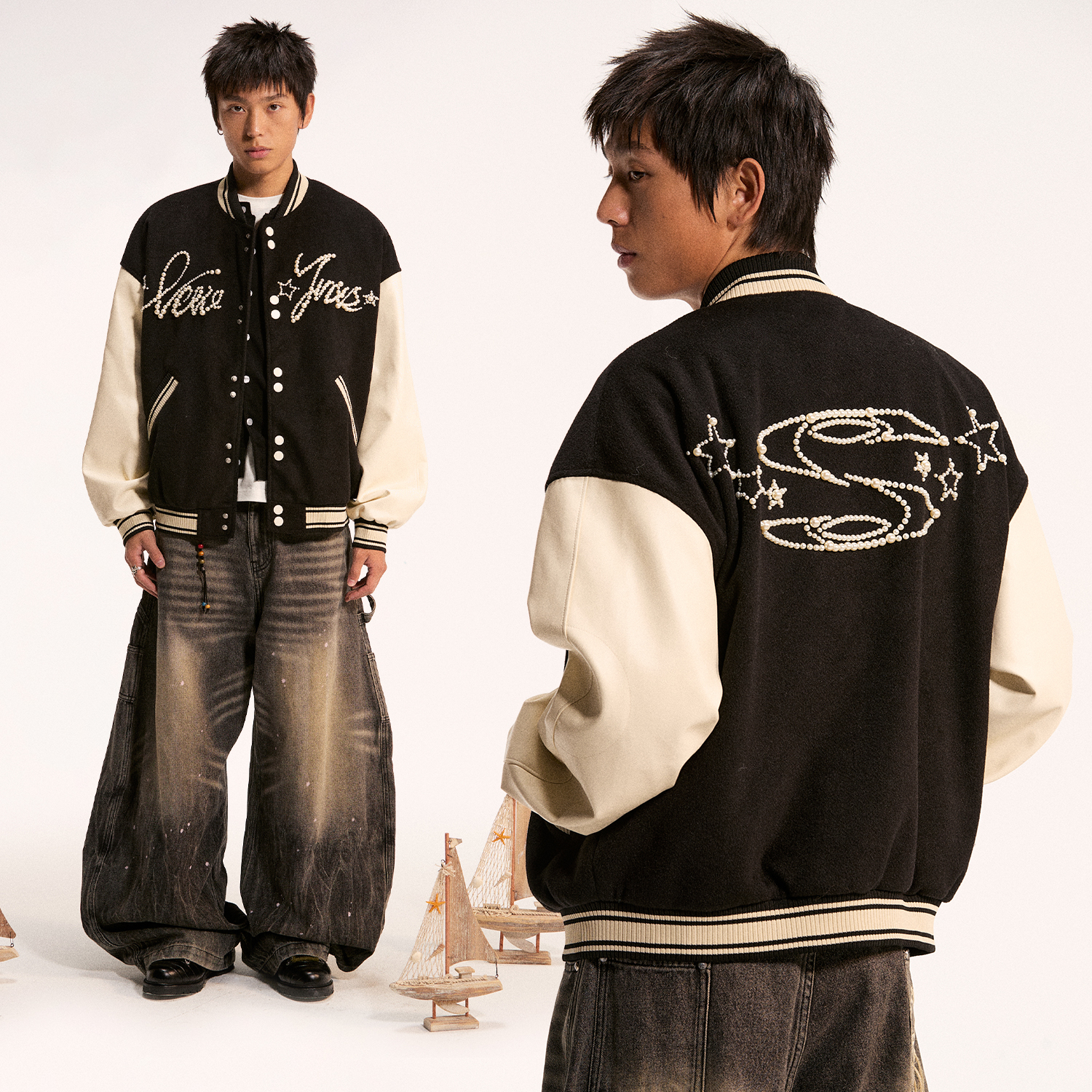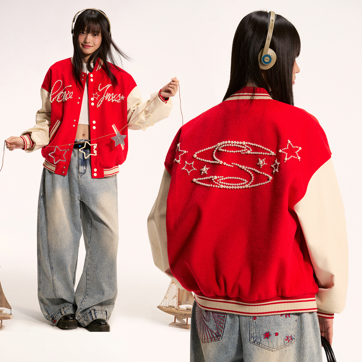 江南先生NewJNXS重工钉珠图案撞色棒球服秋休闲夹克棉服外套男女