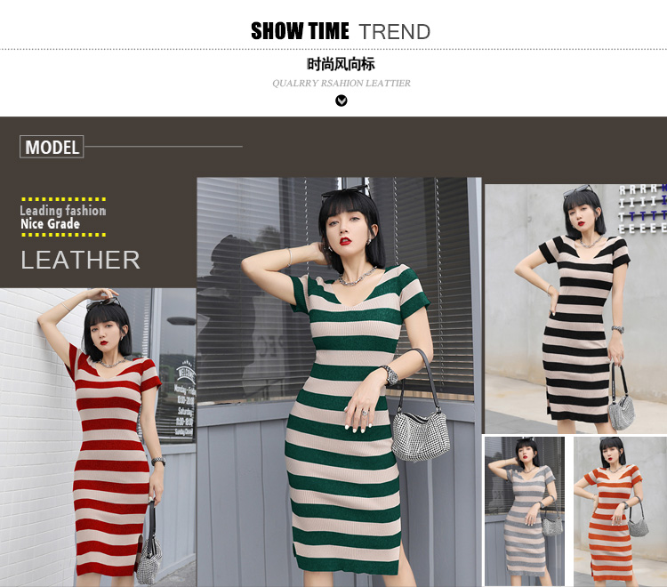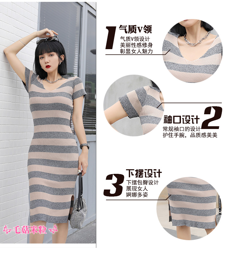 针织连衣裙夏季薄款长款过膝开叉修身包臀v领性感显瘦条纹冰丝裙
