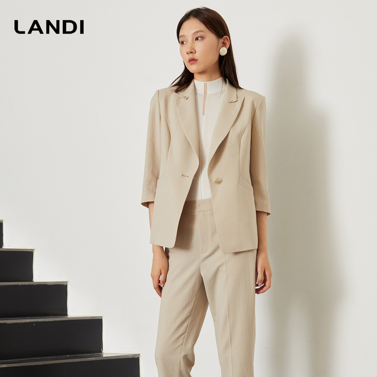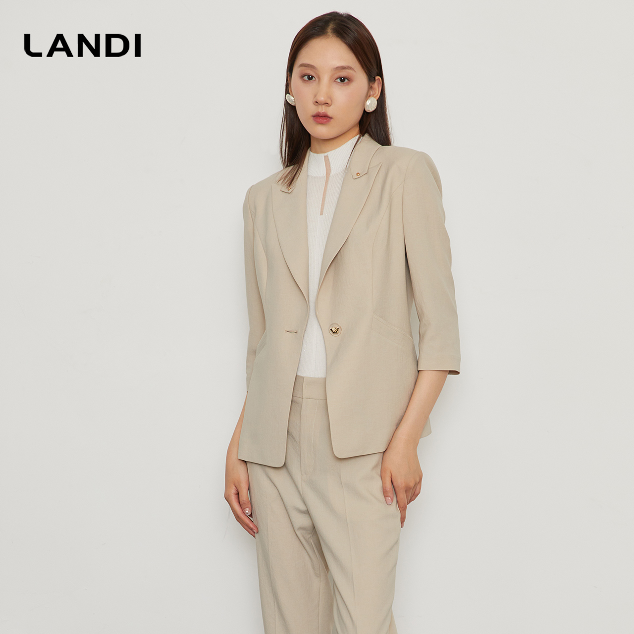 LANDI白茶色戗驳领一粒扣收腰西装外套女七分袖西服秋新品