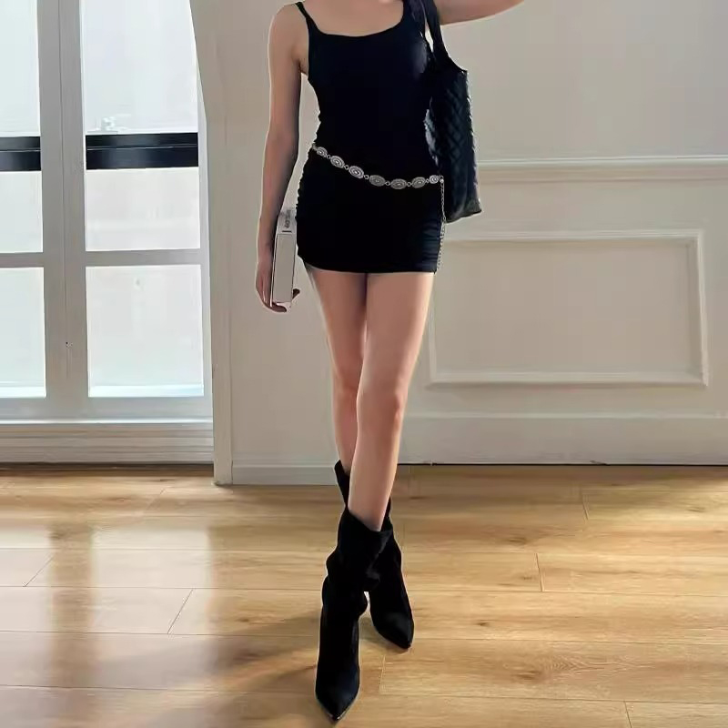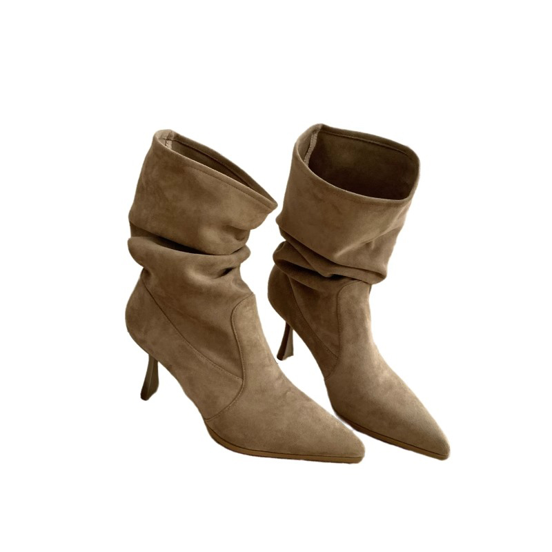 百搭短筒堆堆靴细跟高跟西部牛仔靴短靴女显瘦时装中筒单靴子尖头