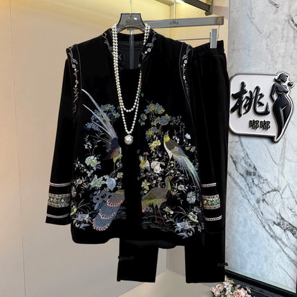 新中式国风特大码女装2025秋季新款高级感丝绒马甲裤子胖mm三件套