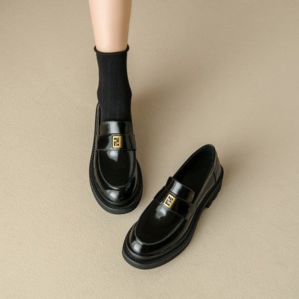 金属扣厚底乐福鞋女2025年秋季新款真皮圆头英伦风小皮鞋粗跟单鞋
