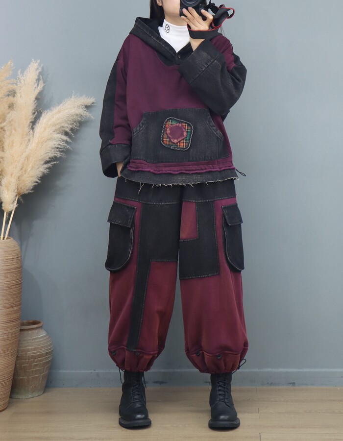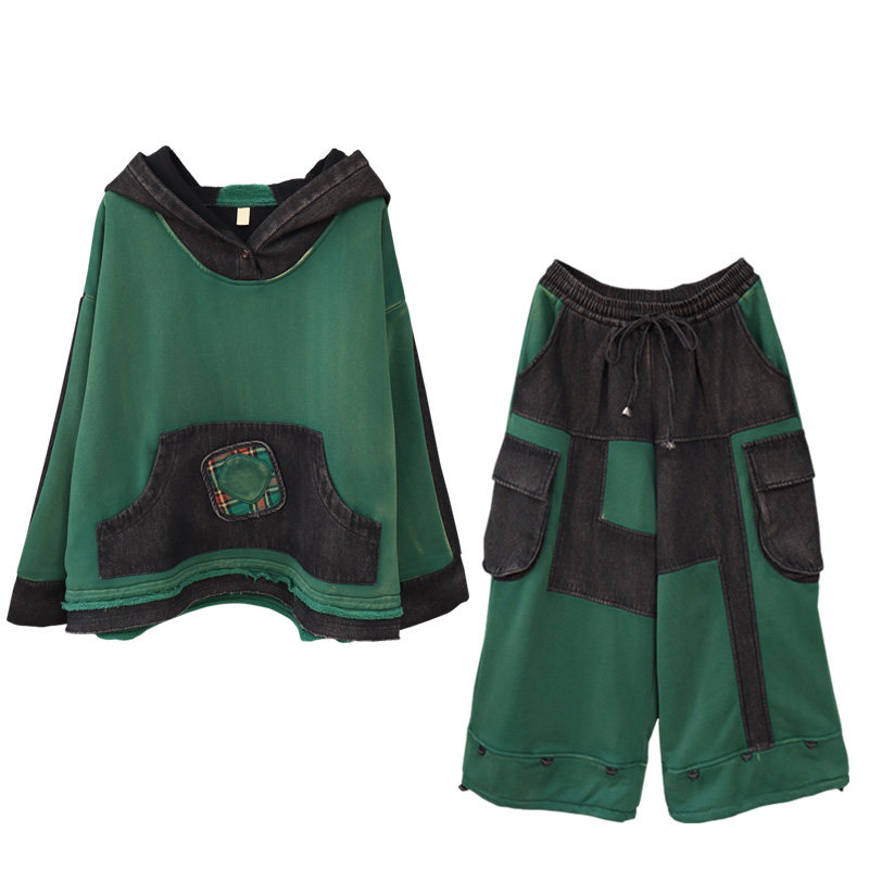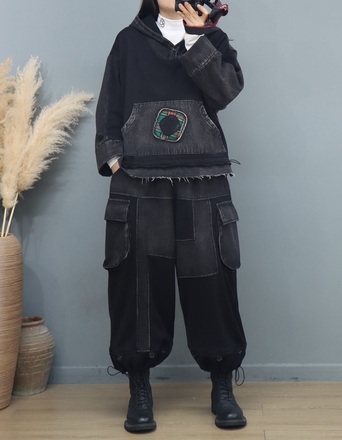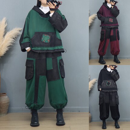复古炒色做旧牛仔拼接连帽卫衣灯笼裤女冬季加绒加厚个性休闲套装