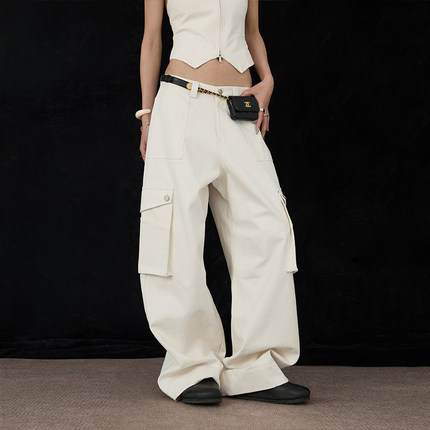 ourhour 立体大贴袋 象牙白解构美式宽松阔腿裤 女春设计感工装裤