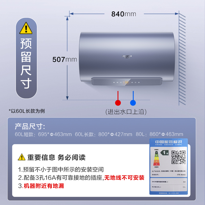 [国补20%]AO史密斯佳尼特电热水器60/80升JC2阻垢免清洗双3kW速热