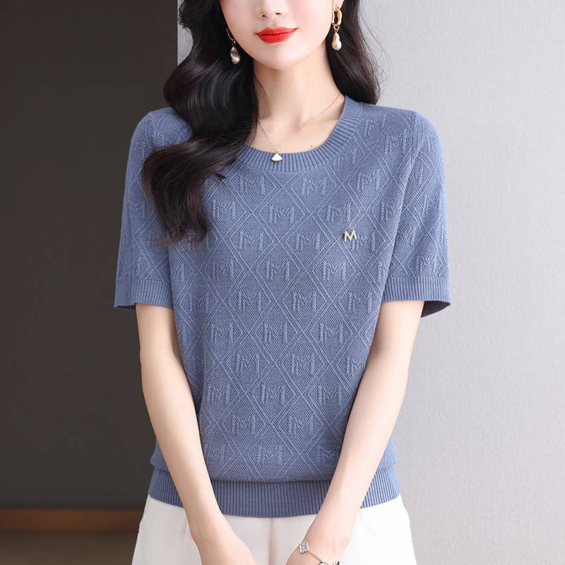中年妈妈夏装冰丝短袖t恤女宽松加大码洋气针织薄上衣桑蚕丝体恤