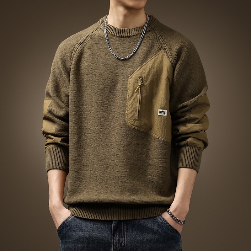 重磅复古高端美式拼色口袋毛衣男春季潮牌加厚宽松大码男士针织衫