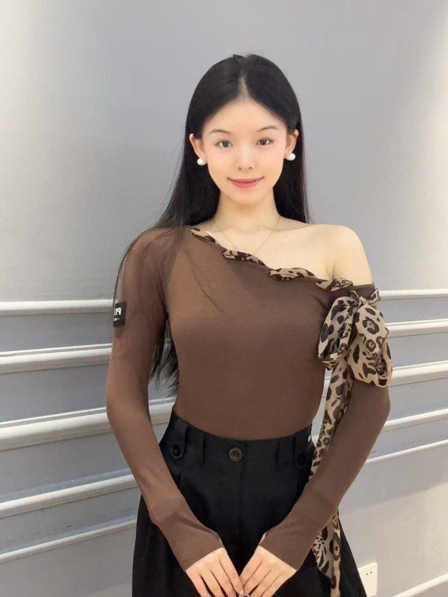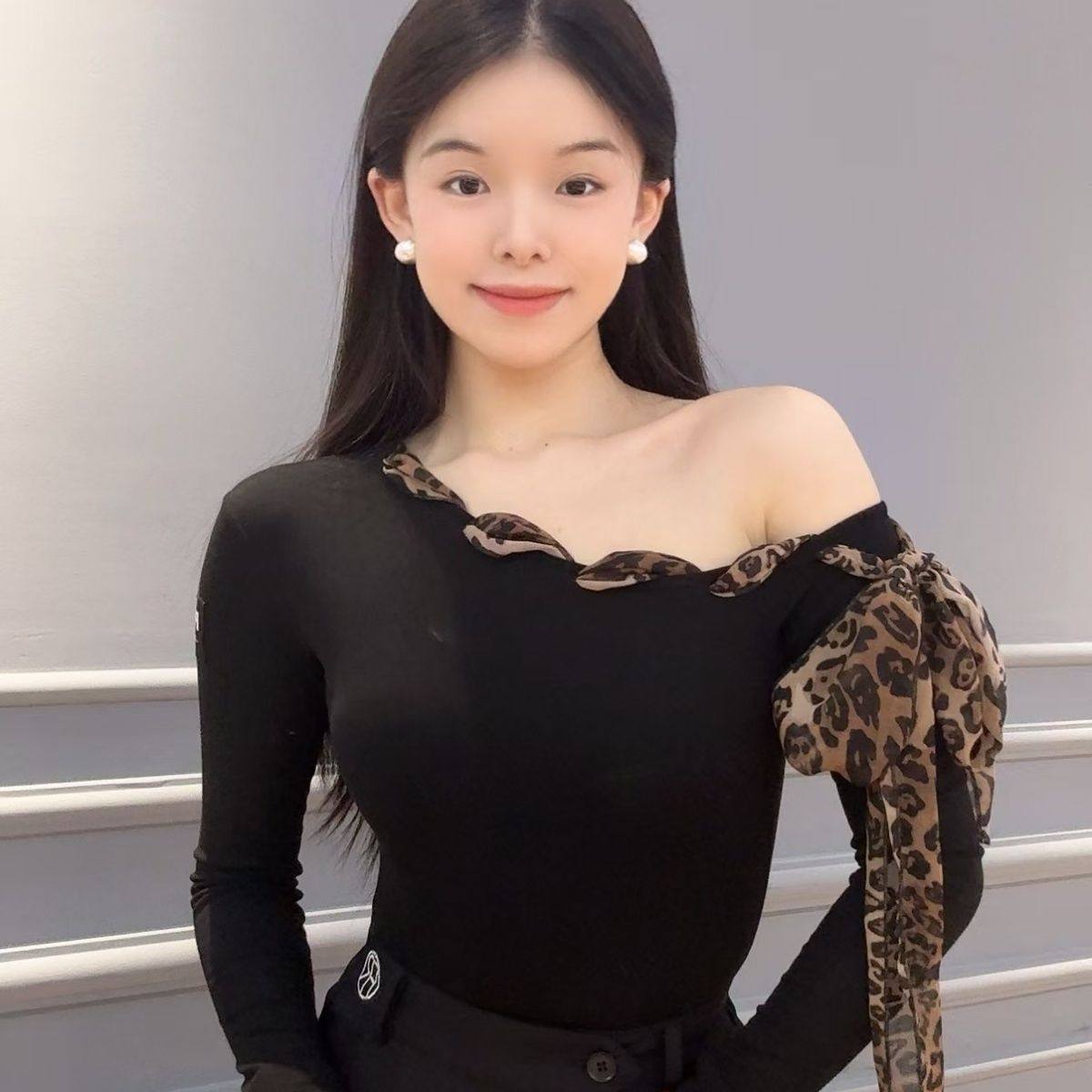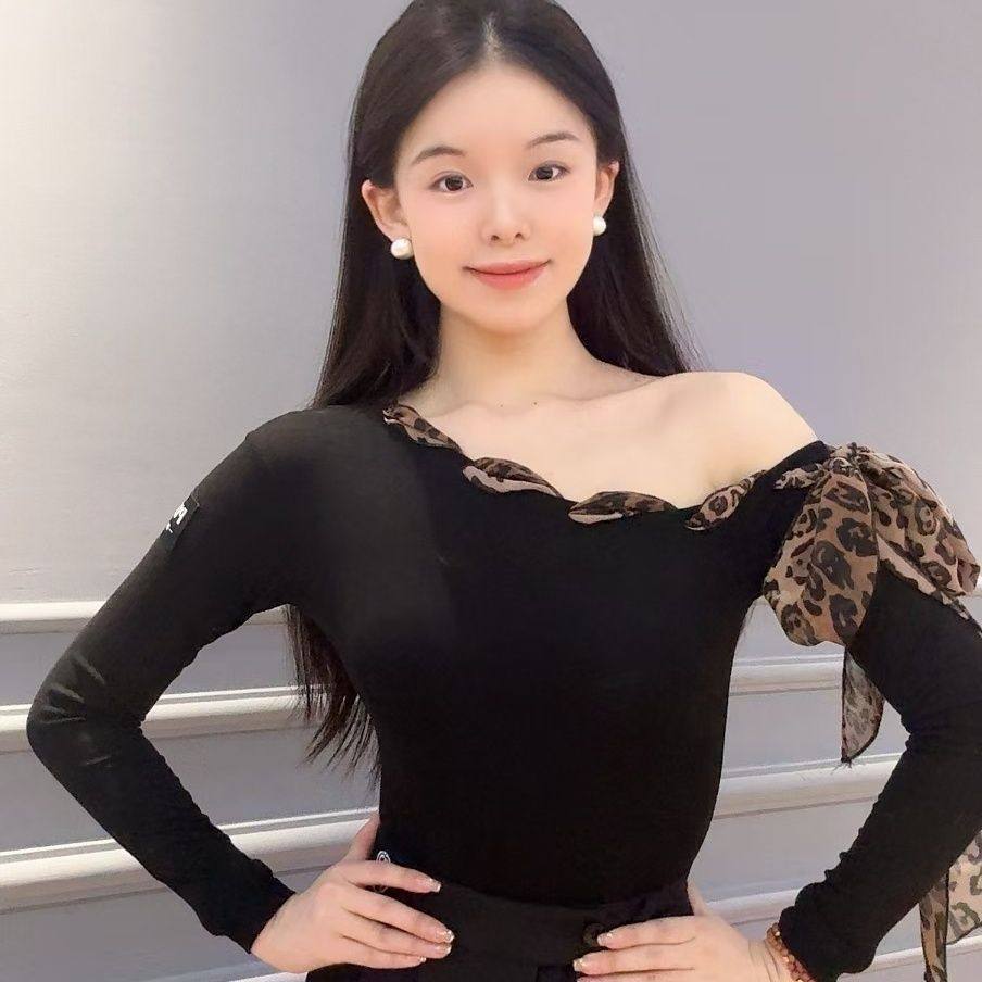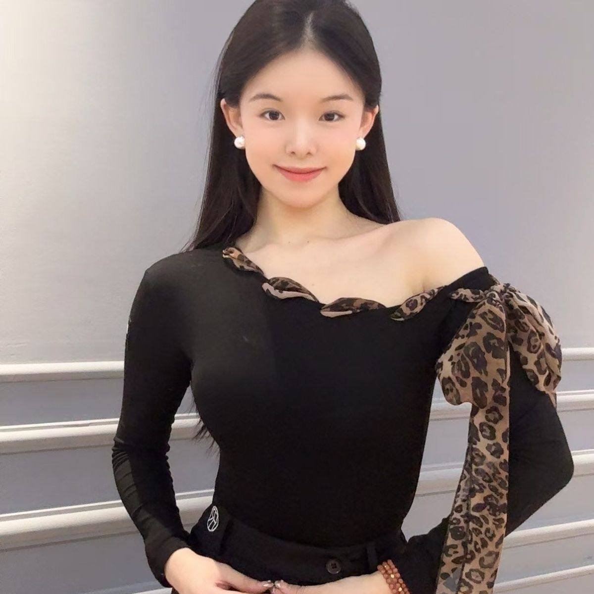 punk019拉丁舞上装自带胸垫底裤豹纹飘带露肩上衣高级