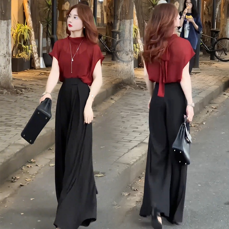 气质名媛高端时尚洋气套装女2025夏季大码欧货雪纺衫阔腿裤两件套