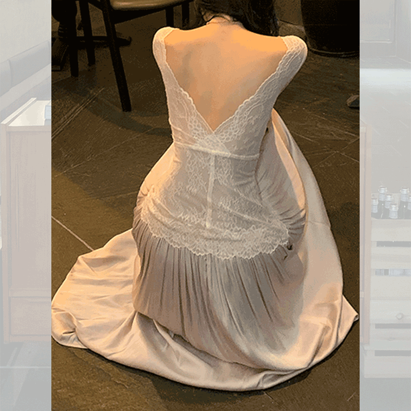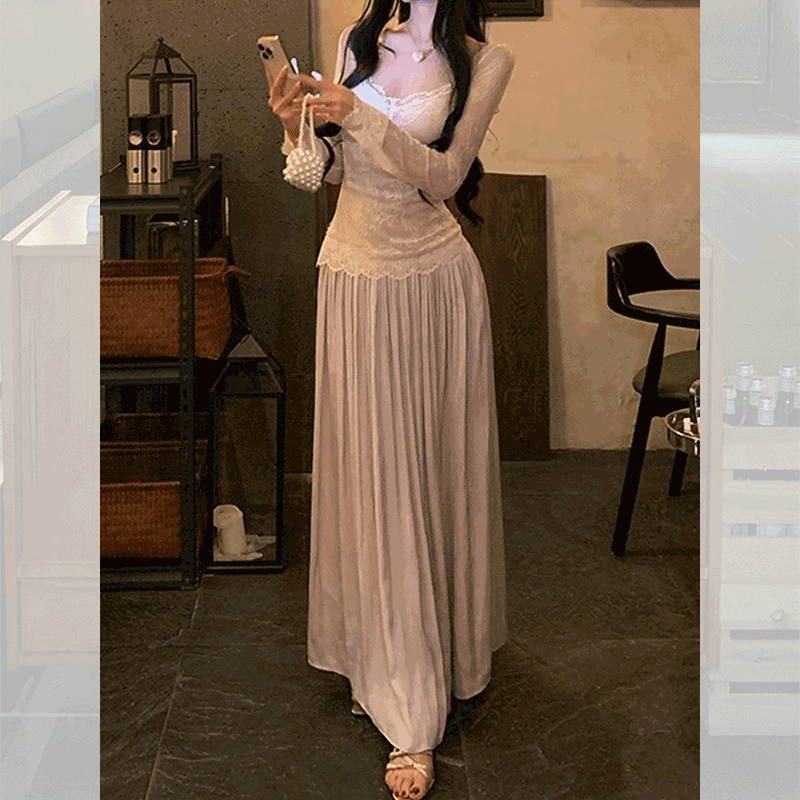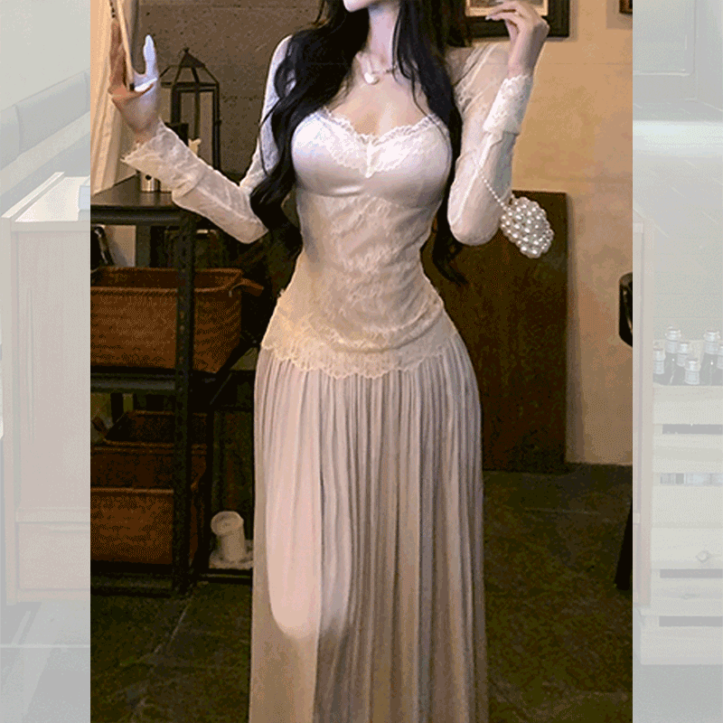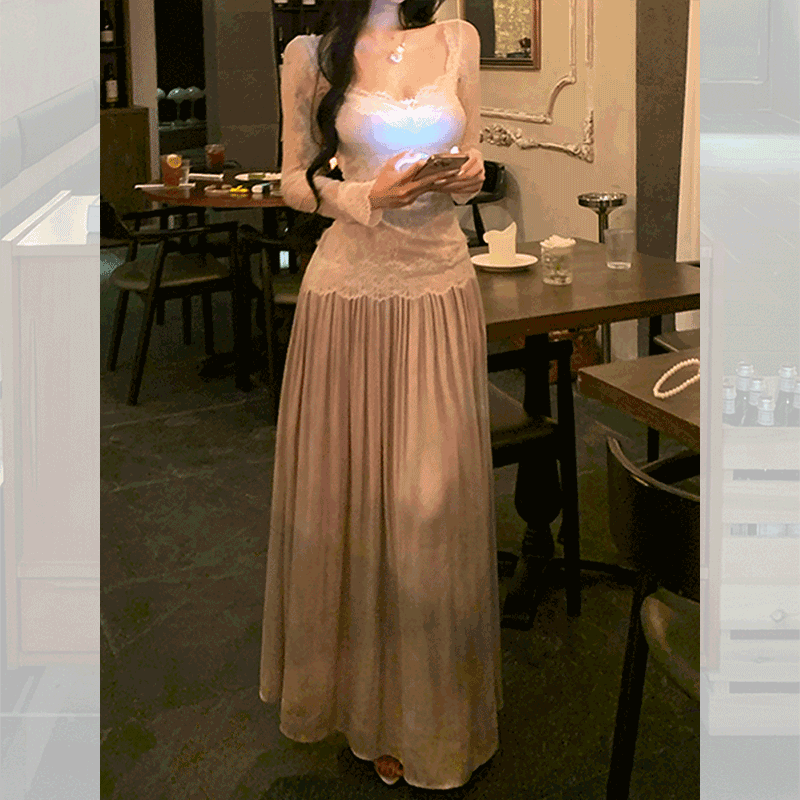 韩系高级感蕾丝拼接连衣裙女2025秋冬长袖a字裙露背长裙法式裙子
