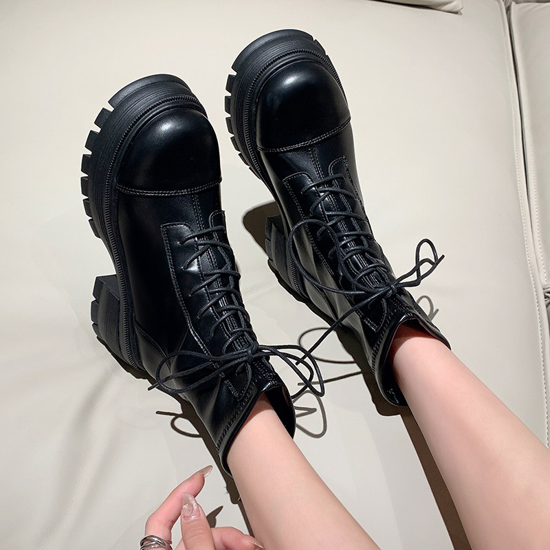 厚底炸街短靴女2025年秋冬新款前系带马丁靴女粗跟爆款黑色靴子潮