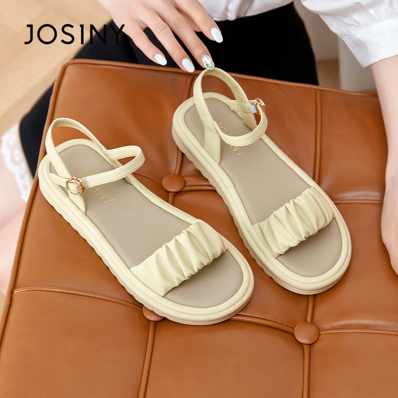 卓诗尼女凉鞋夏季外穿撤柜正品舒适百搭平底露趾凉鞋褶皱一字带女
