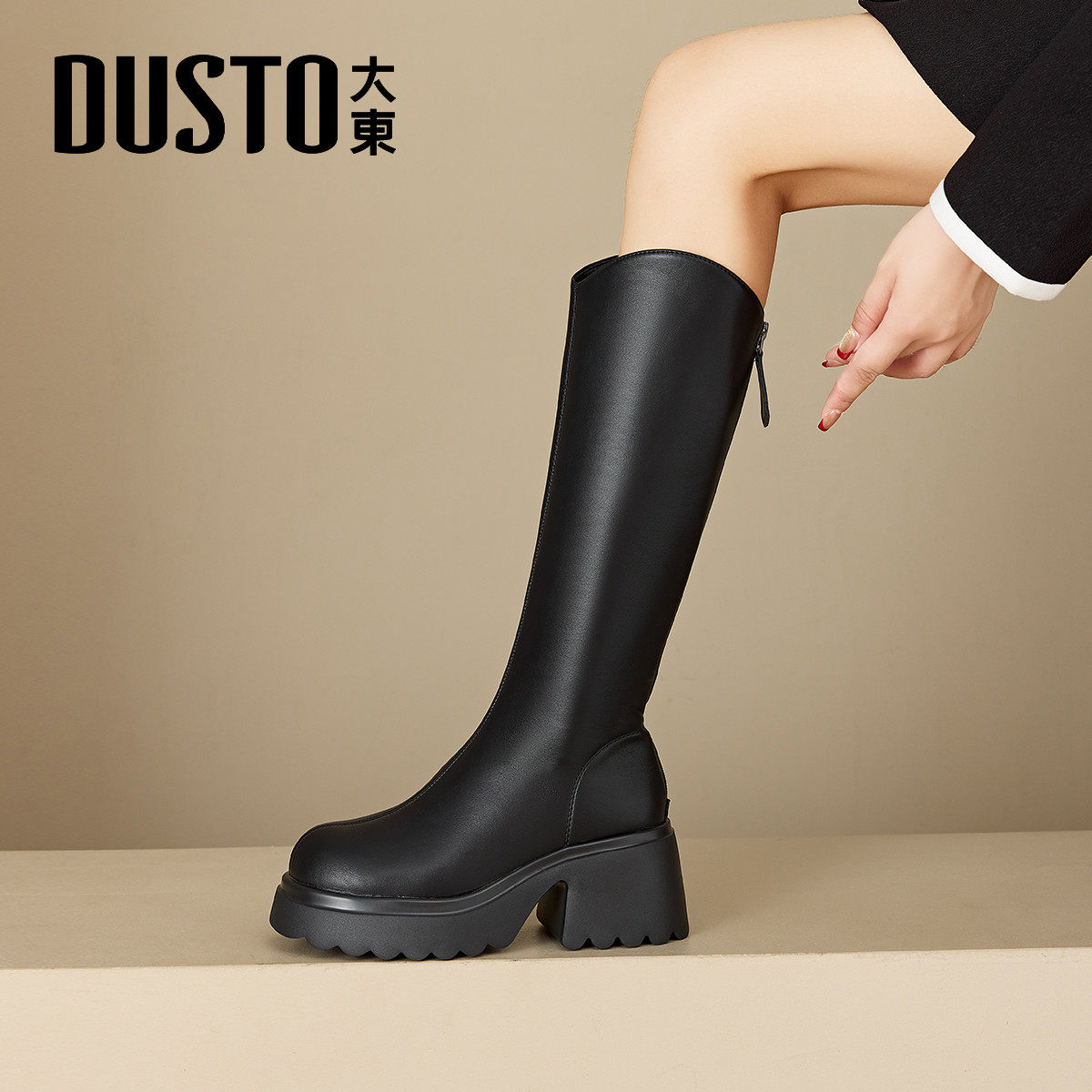 大东官方正品黑色厚底显瘦长筒靴
