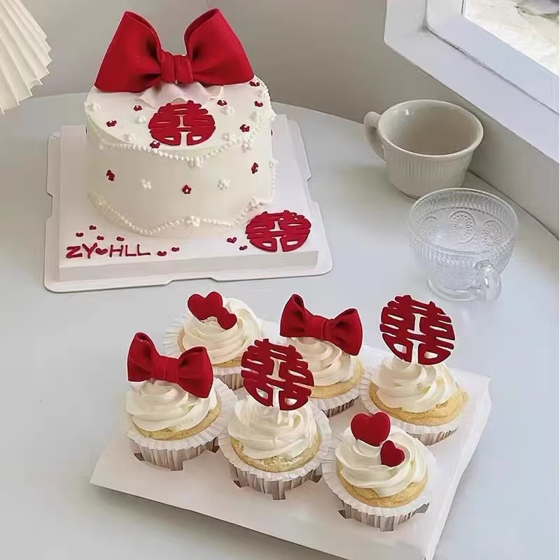 中式订婚红色纸杯蛋糕装饰摆件婚庆红双喜字婚礼结婚甜品台插件