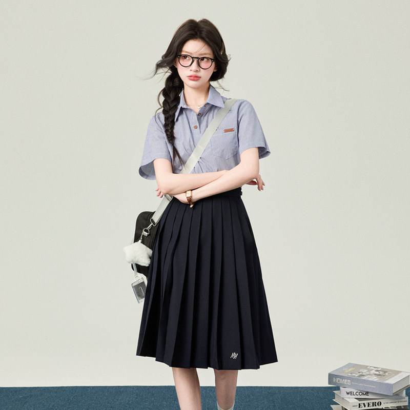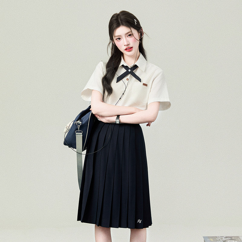 花铃太太学院风polo领套头条纹衬衫夏季短袖衬衣女jk制服基础款