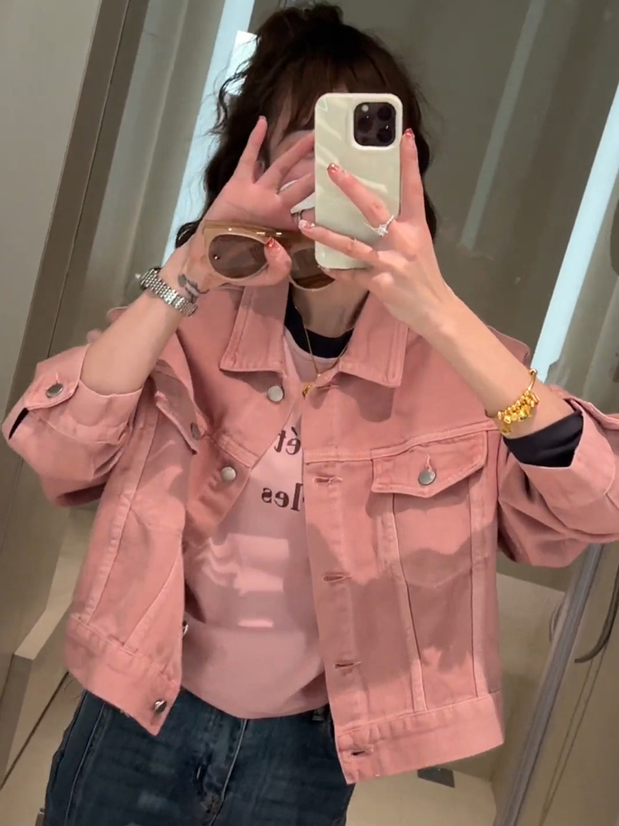 2025春装新款彩色牛仔外套女短款韩版宽松长袖夹克小个子粉色上衣