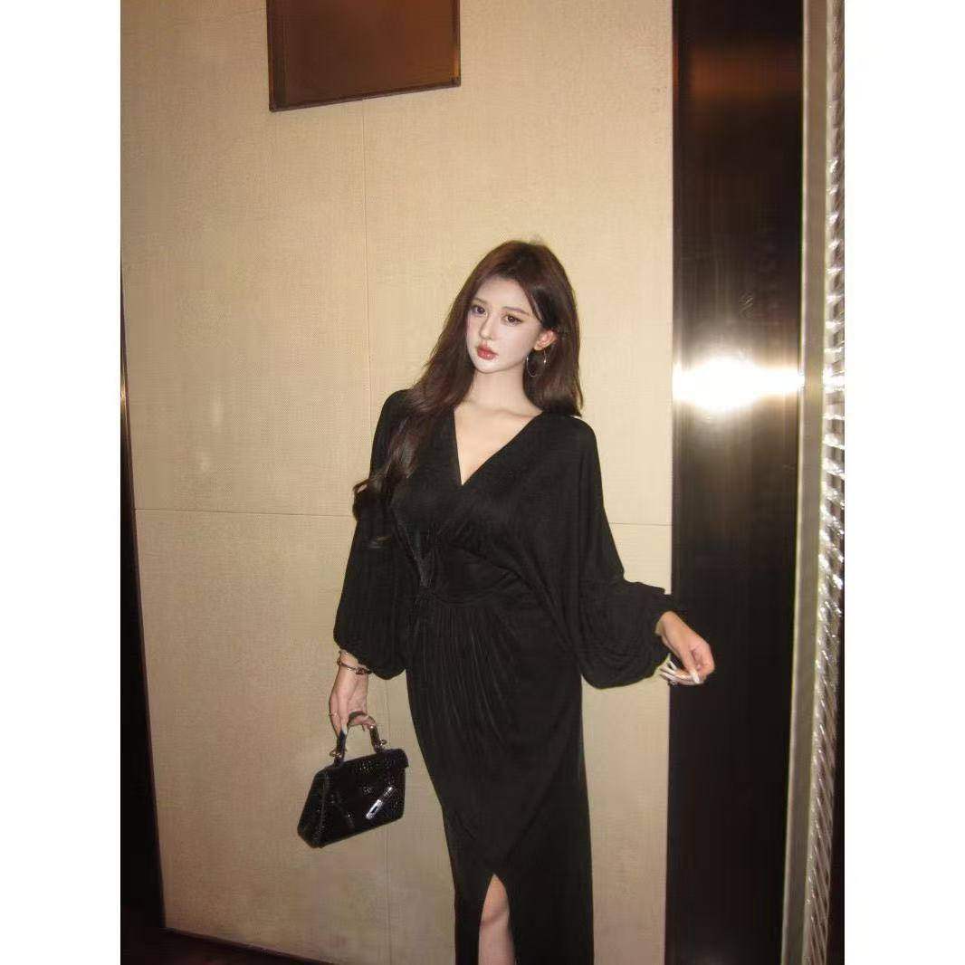 气质黑色v领长袖连衣裙女夏季感收腰开叉裙子修身纯欲a字长裙女装
