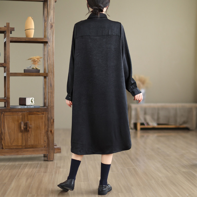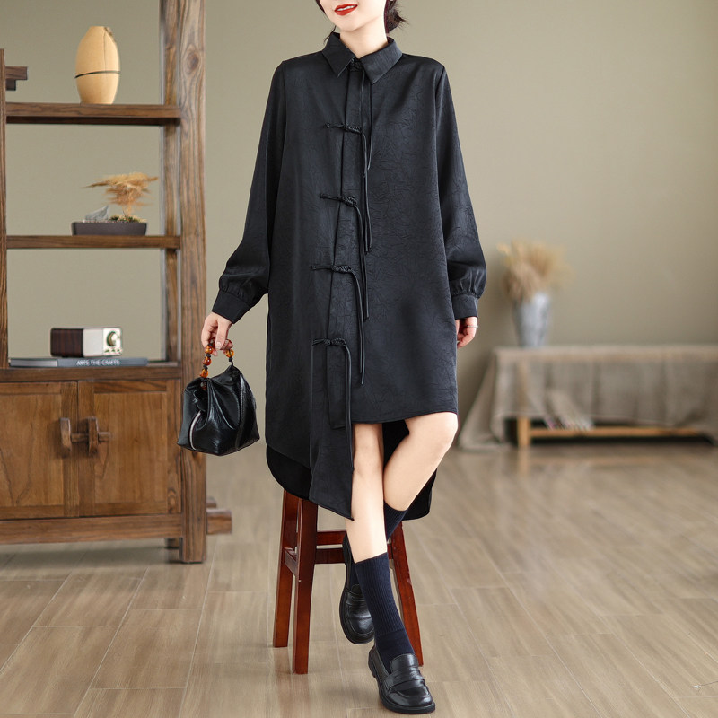 黑色国风衬衫裙女2024春季新款POLO领小众设计感盘扣中长款连衣裙