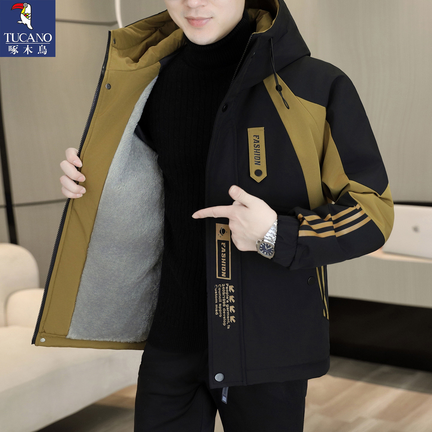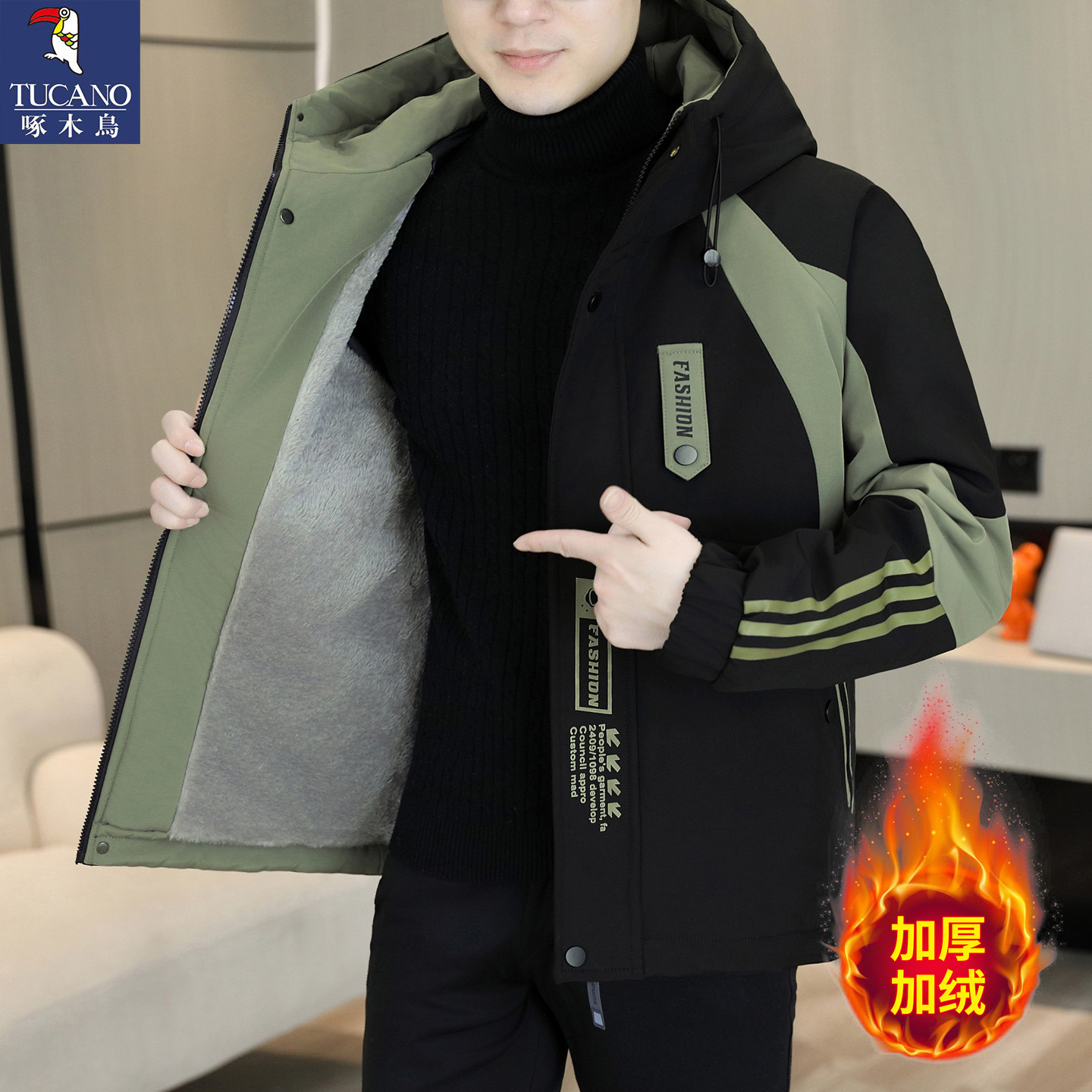 啄木鸟冬季加绒加厚棉衣男士韩版连帽潮流外套休闲工装夹克冲锋衣