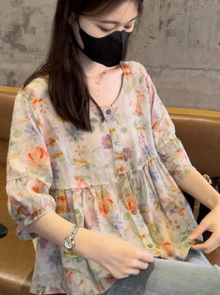 棉麻碎花上衣女中袖大码胖mm宽松遮肚子显瘦短袖t恤衫薄款娃娃衫