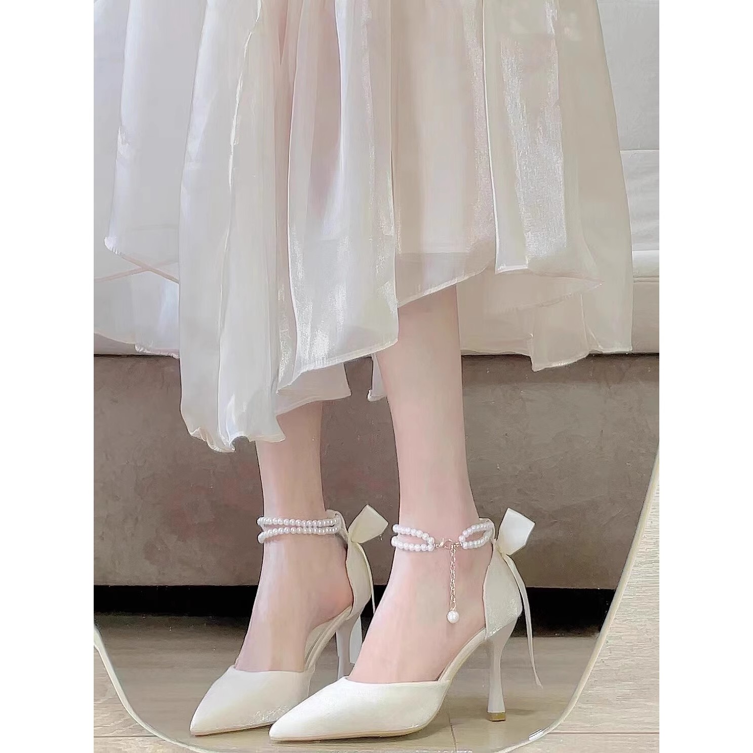 法式仙女风气质细跟高跟鞋女2024新款珍珠蝴蝶结一字带包头凉鞋女