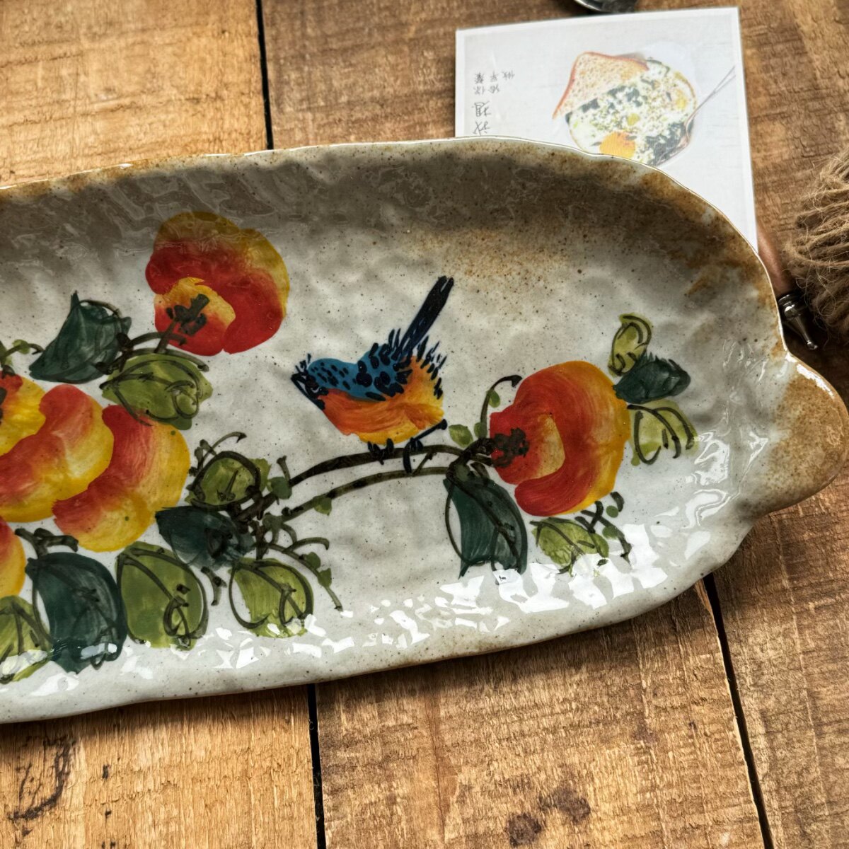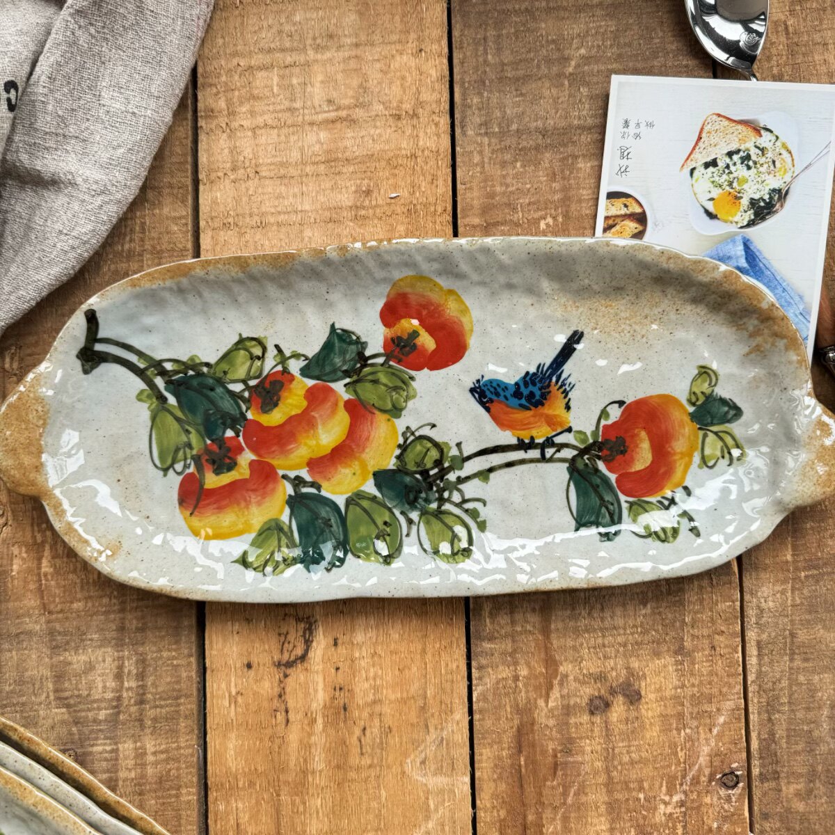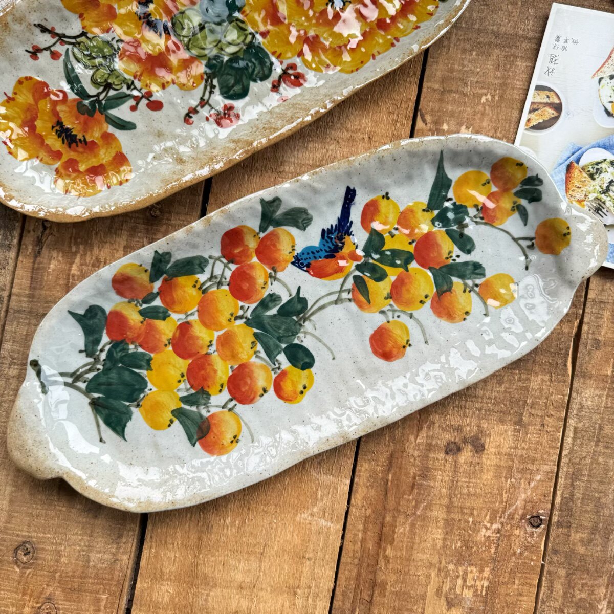 景德镇手作双耳鱼盘寿司盘中式陶瓷水果盘手工甜品盘手绘枇杷釉下