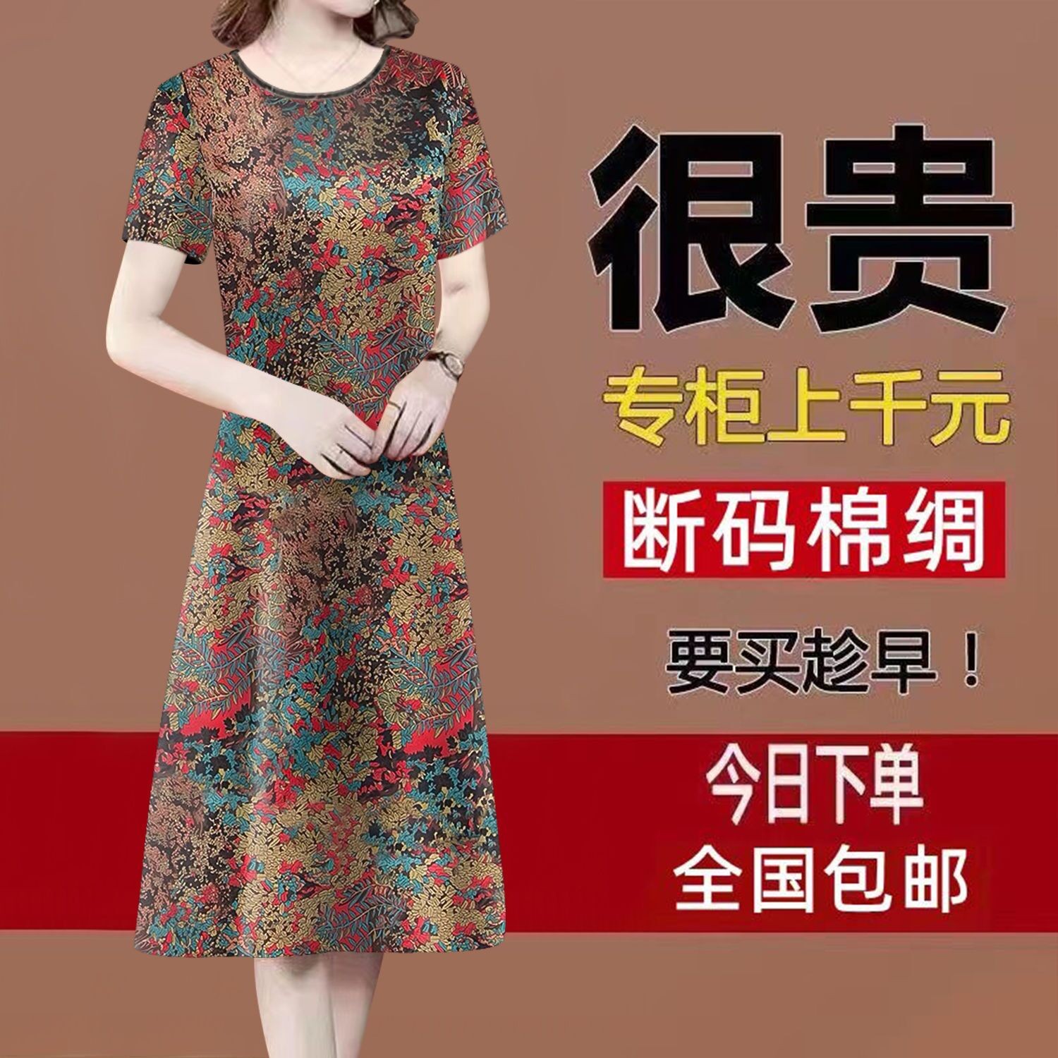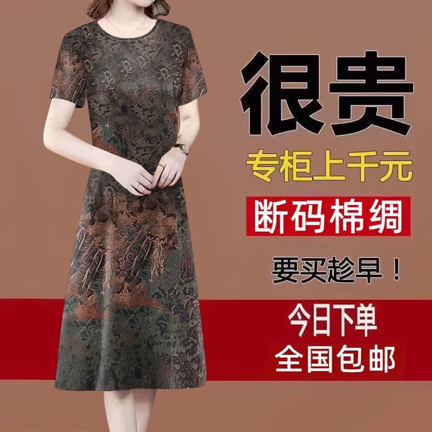 中老年妈妈装100%人棉夏新款大码修腰显瘦棉绸连衣裙高档中长裙子