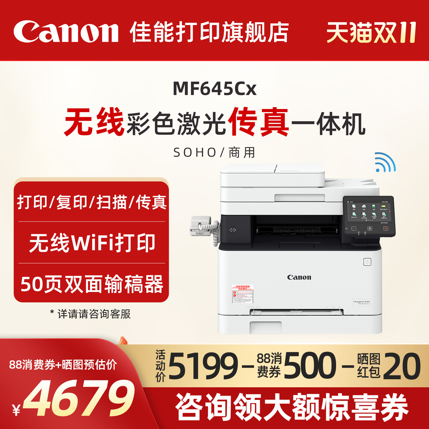 佳能旗舰店MF641Cw/MF643Cdw/MF645Cx彩色A4激光打印机复印扫描一体机办公商用自动双面可选手机无线WiFI