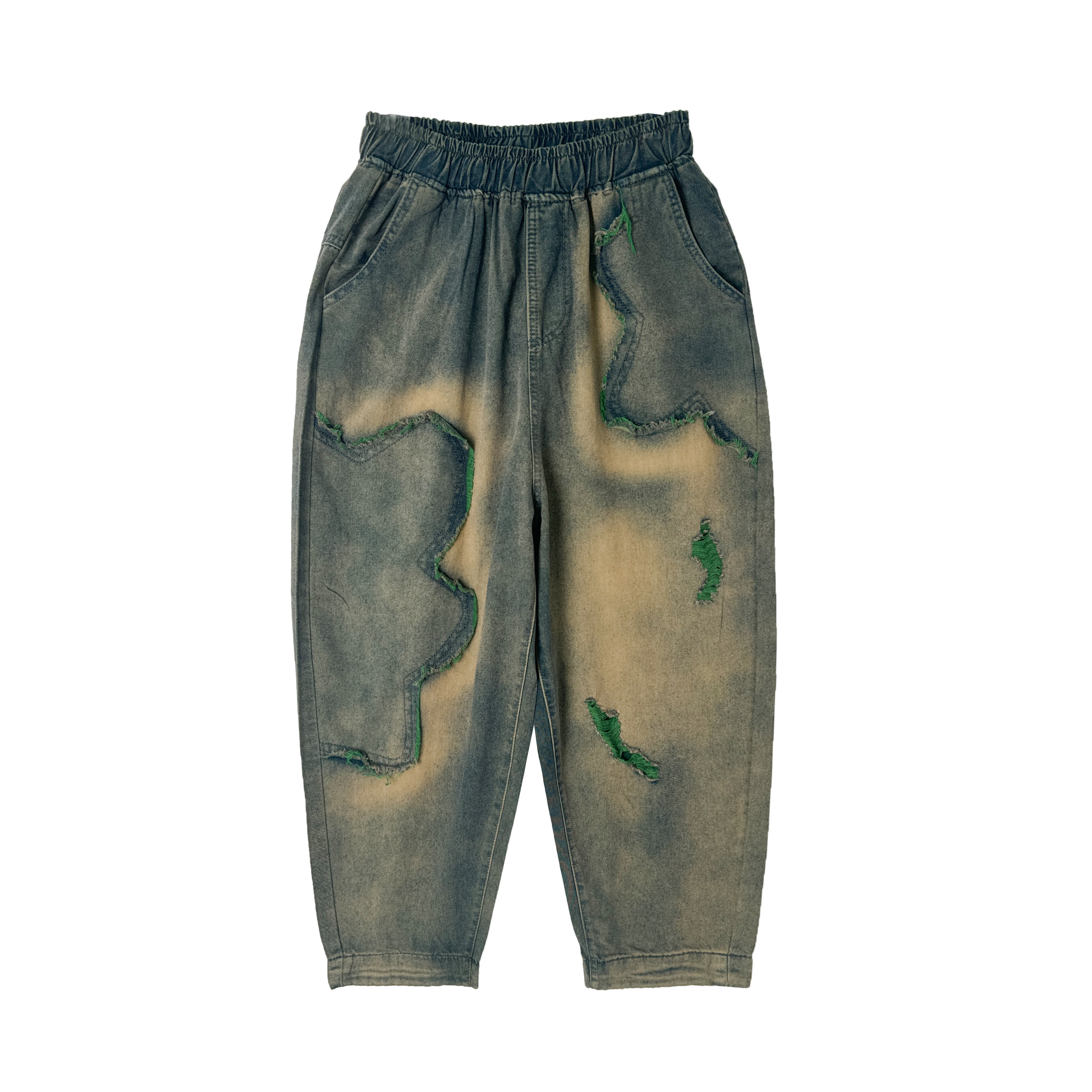 文艺松紧腰撞色贴布破洞牛仔裤女