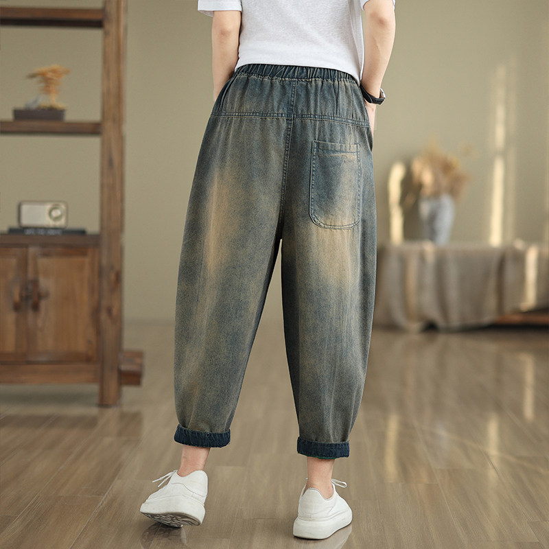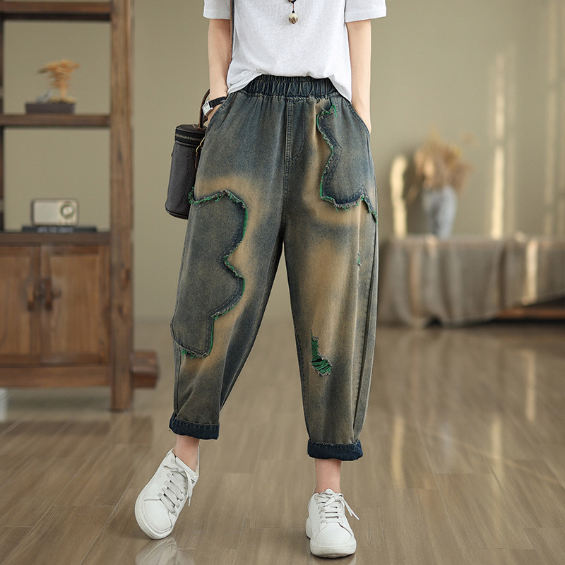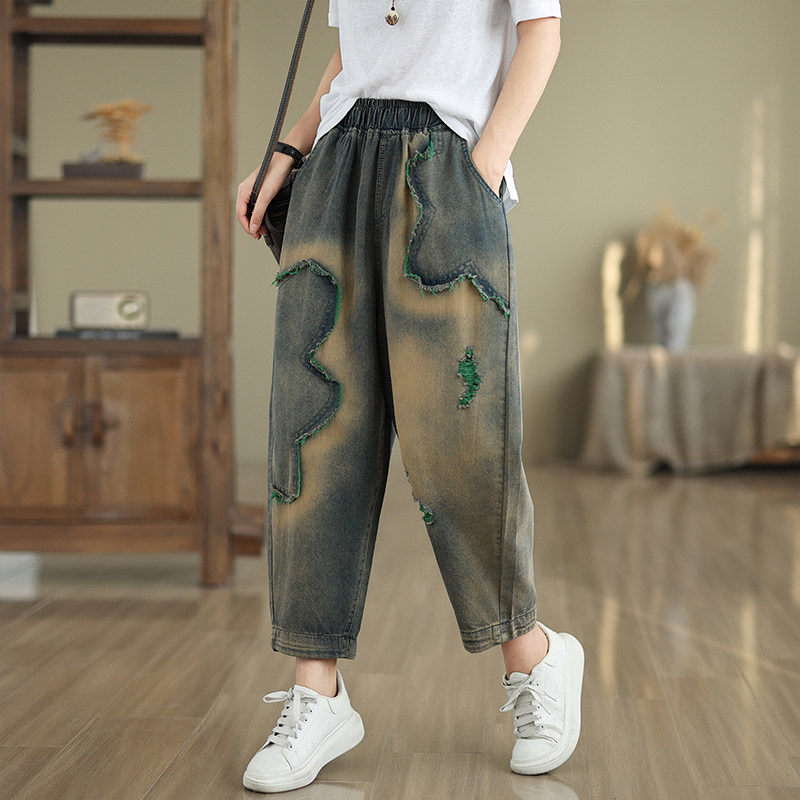 大码女装夏季文艺松紧腰撞色贴布破洞牛仔裤宽松小个子哈伦九分裤