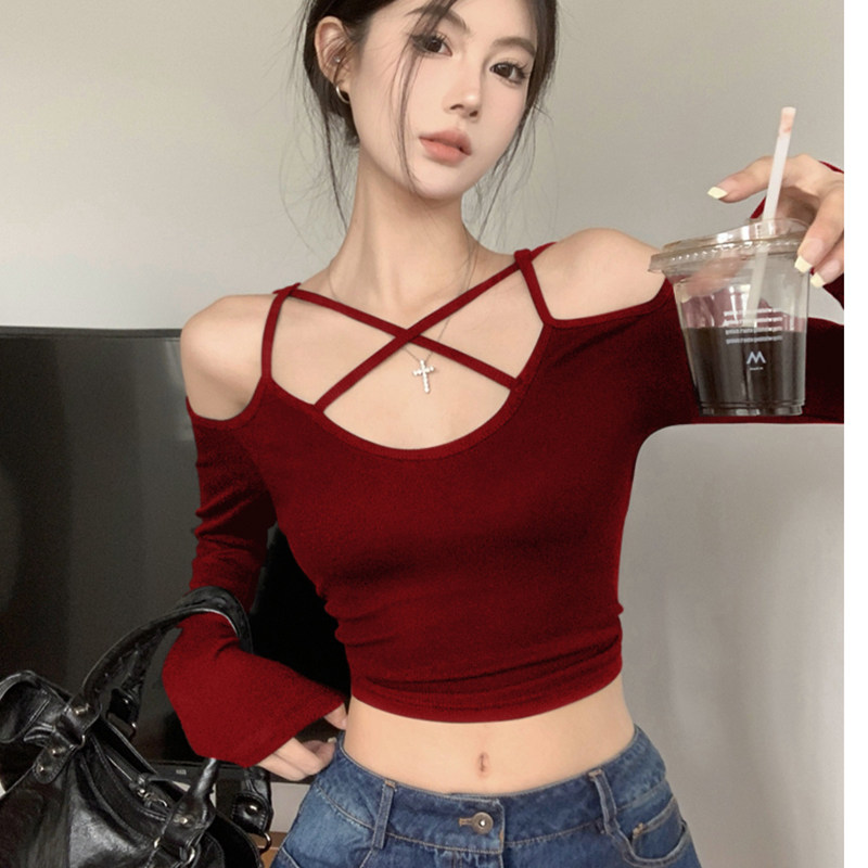2025年春季新款吊带心机设计感上衣女性感露肩白色长袖t恤女短款