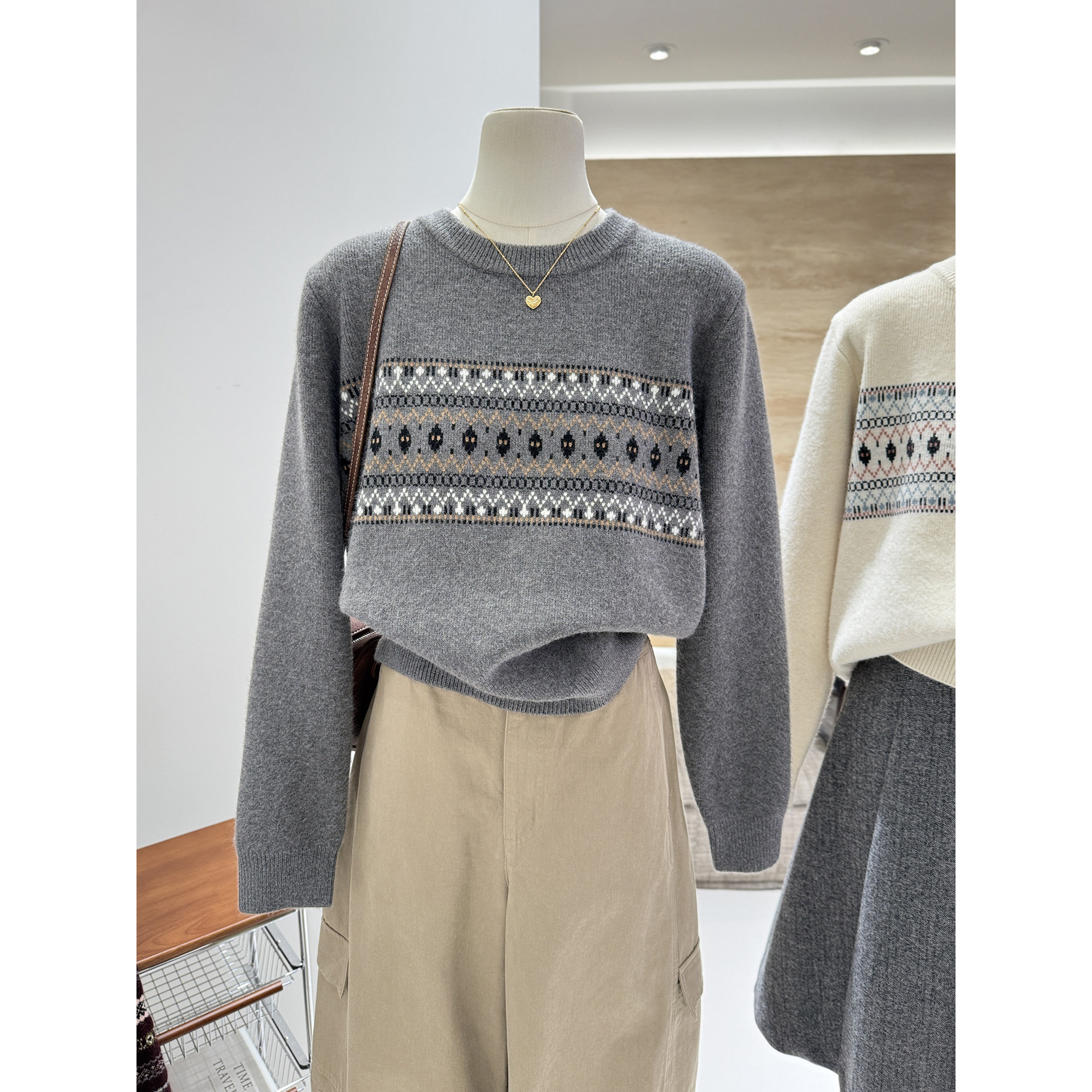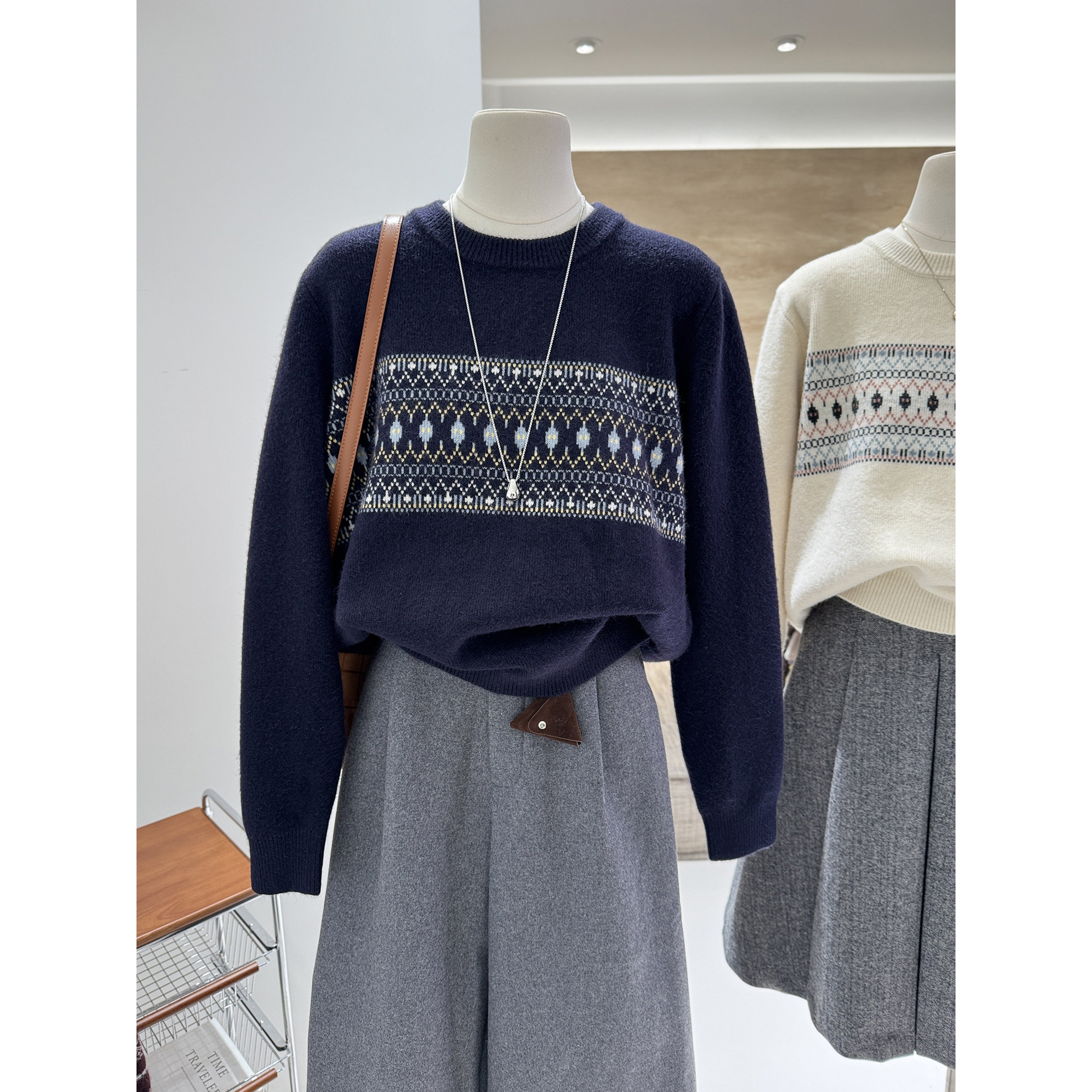 秋冬新款气质复古费尔岛风设计感宽松显瘦保暖圆领套头针织毛衣女