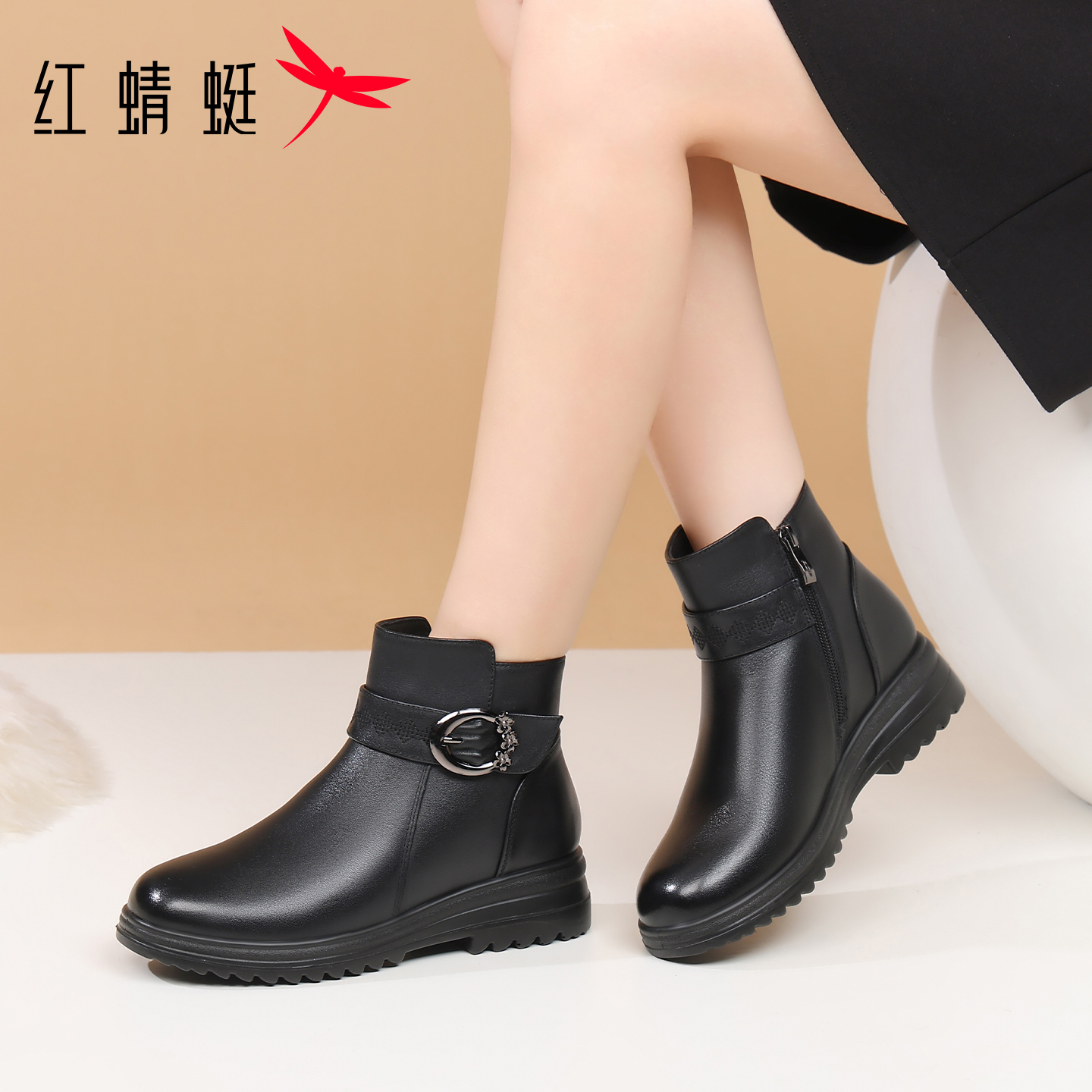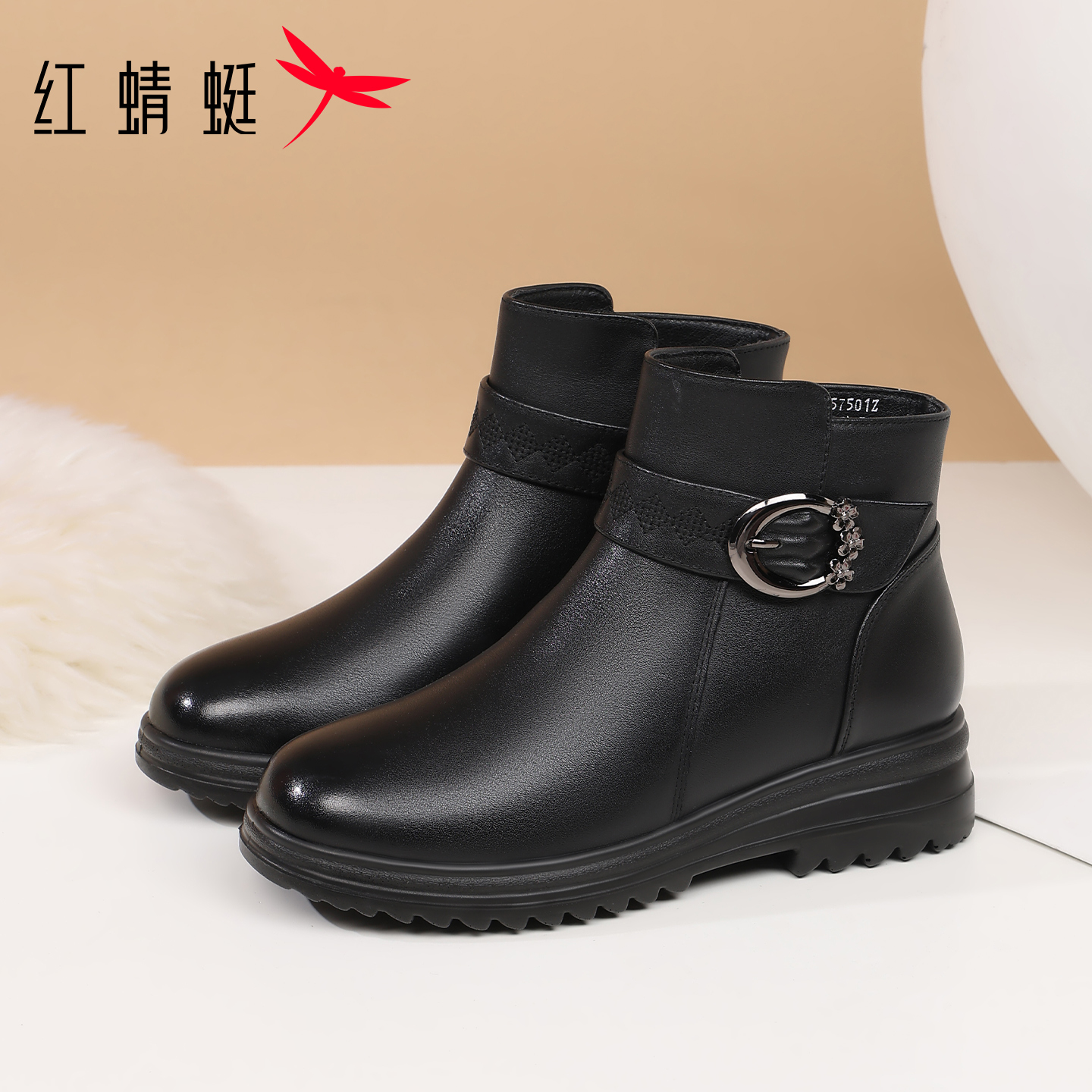 红蜻蜓冬季女鞋羊毛靴子女短靴真皮加绒加厚保暖妈妈棉靴高帮皮鞋