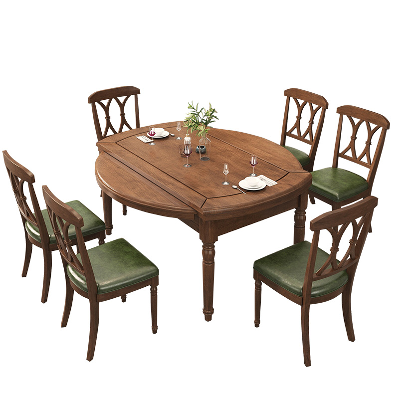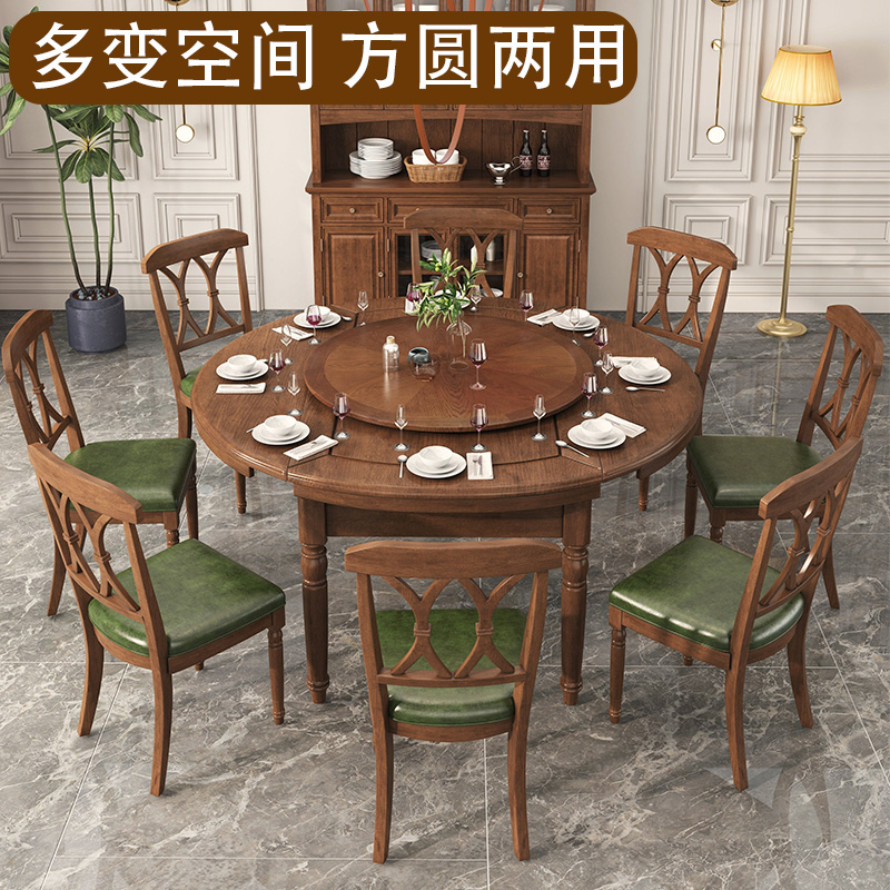 美式实木餐桌圆形摺叠伸缩组合餐桌跳台圆桌餐桌椅组合黑胡桃色