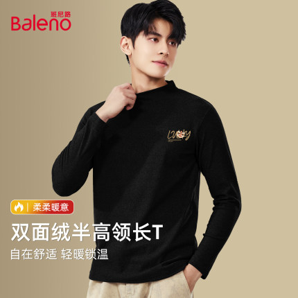班尼路双面绒半高领长袖t恤男秋冬打底衫黑色国风青少年保暖秋衣A
