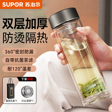 苏泊尔2025新款双层玻璃杯大容量茶水分离泡茶杯便携过滤网水杯子