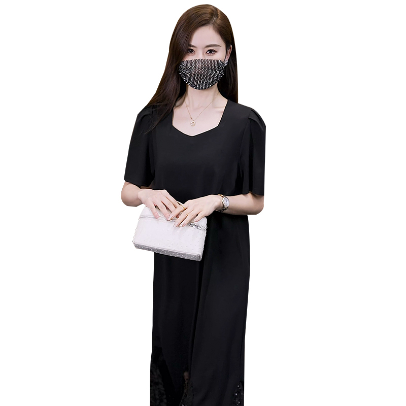 大码女装2025夏季新款高端气质蕾丝拼接通勤时尚黑色短袖连衣裙子