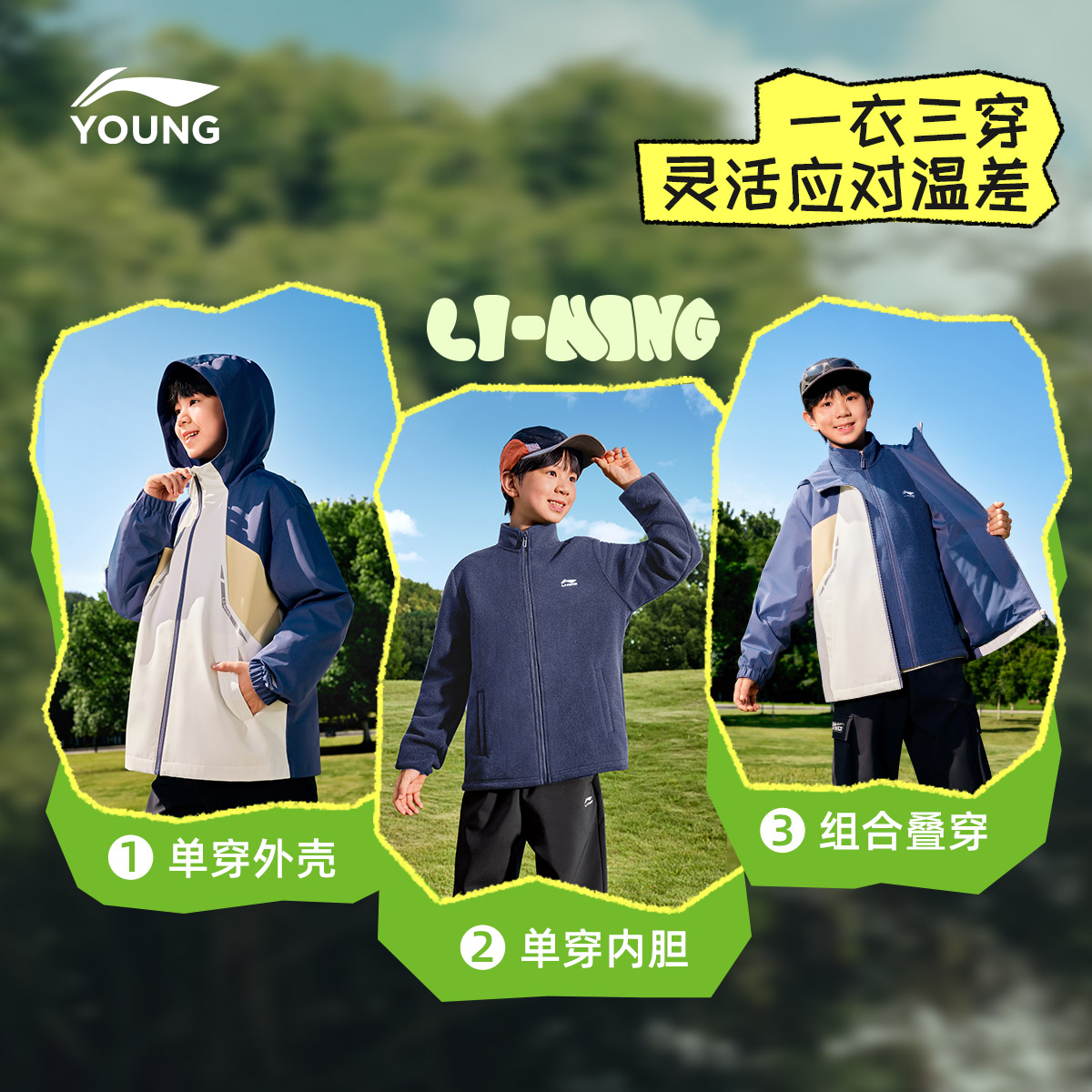 李宁童装三合一运动风衣男大童2025新款反光加绒保暖秋季梭织童装