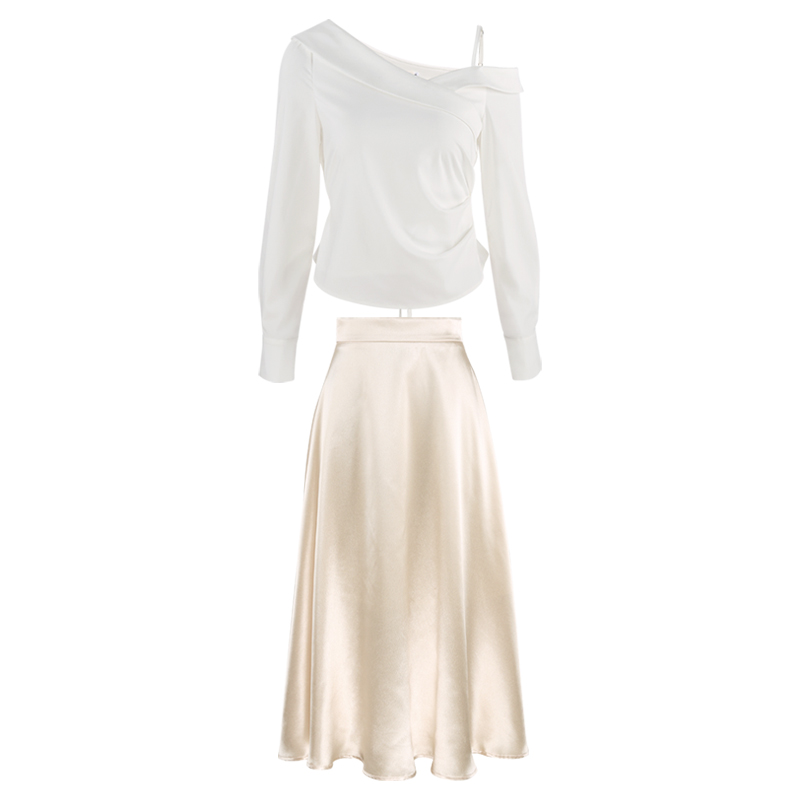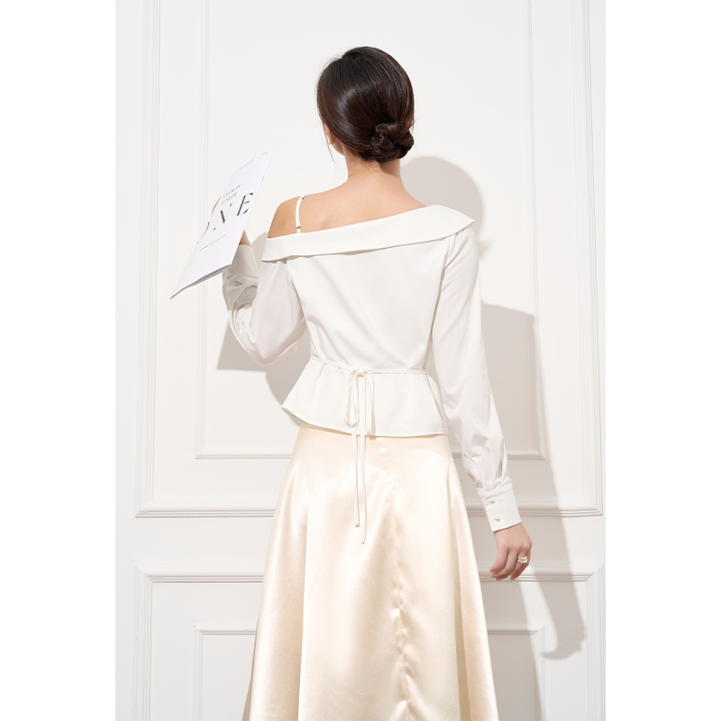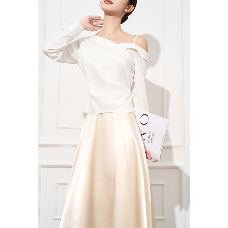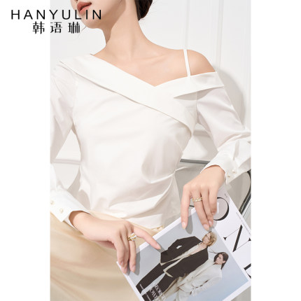 法式气质长袖衬衫女2025新款女秋秋季白色设计个小众短款斜肩上衣