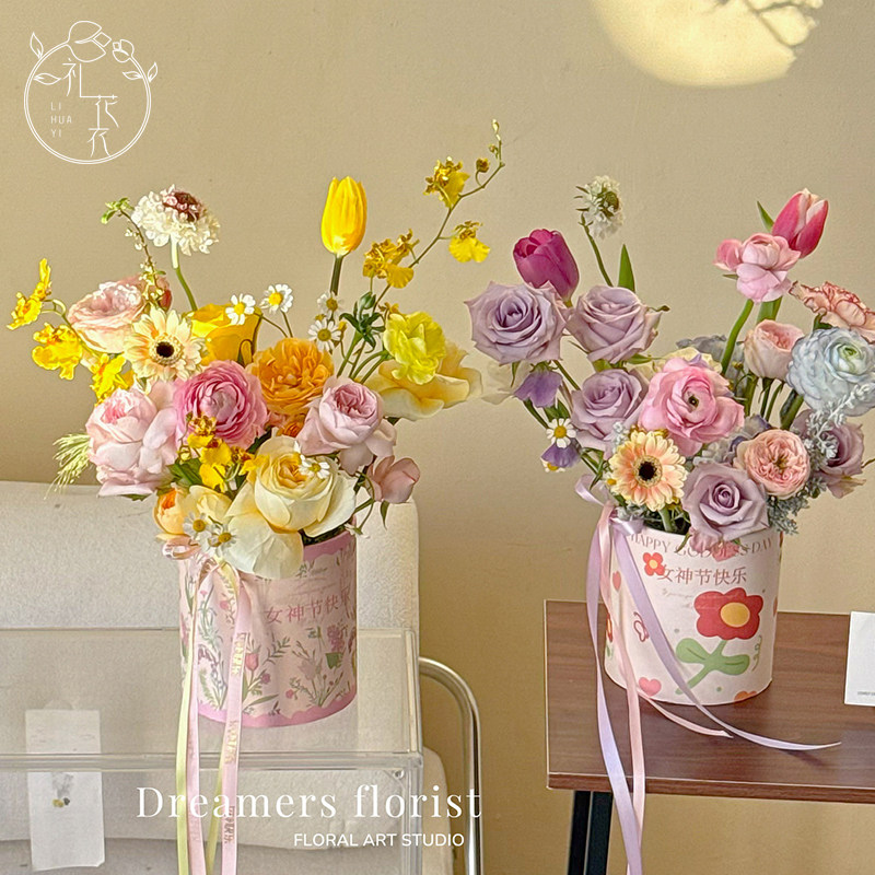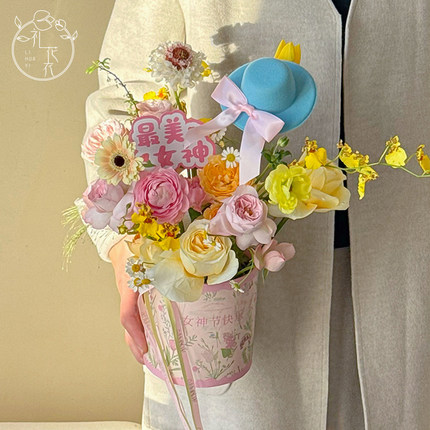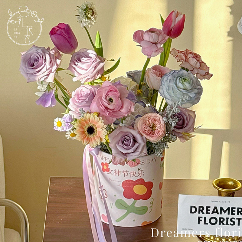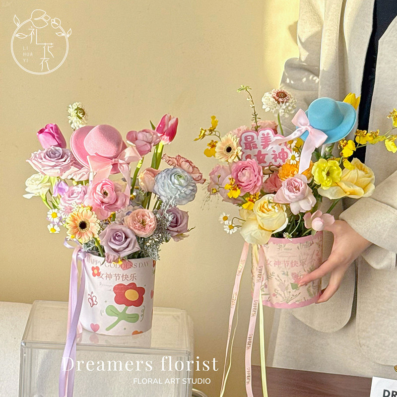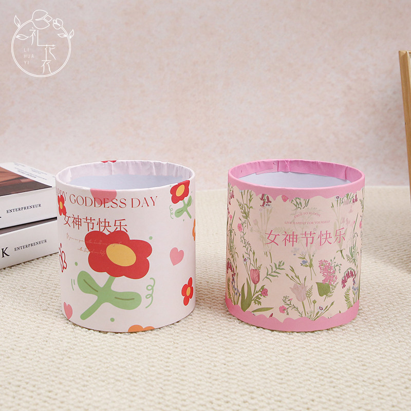 女神节快乐套二小圆桶鲜花束抱抱桶圆形插花盒diy礼盒可爱少女盒