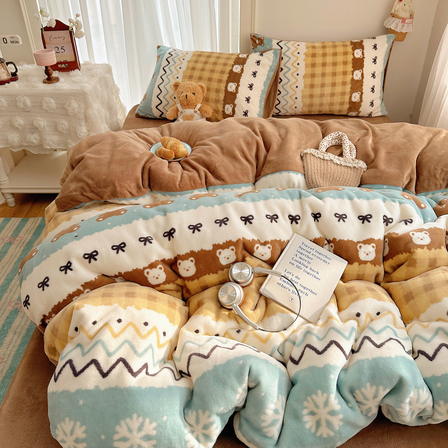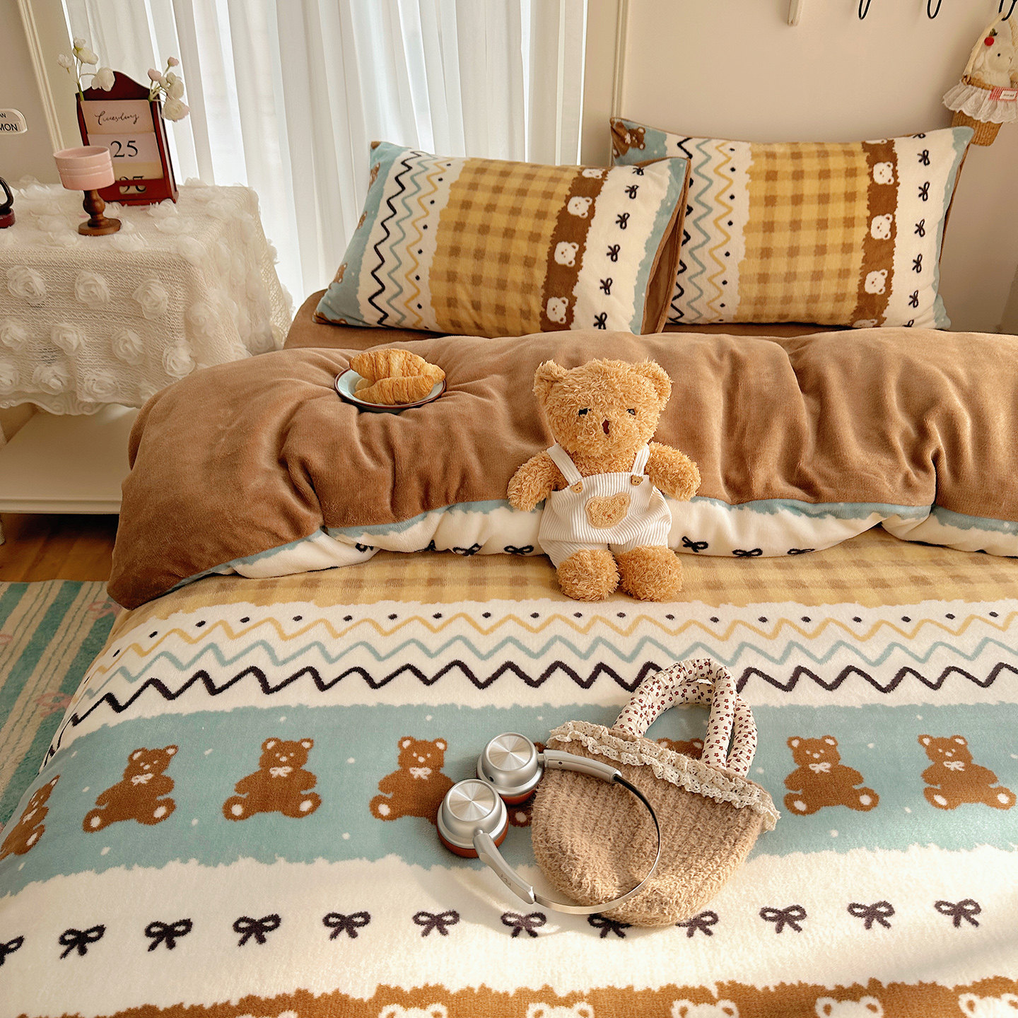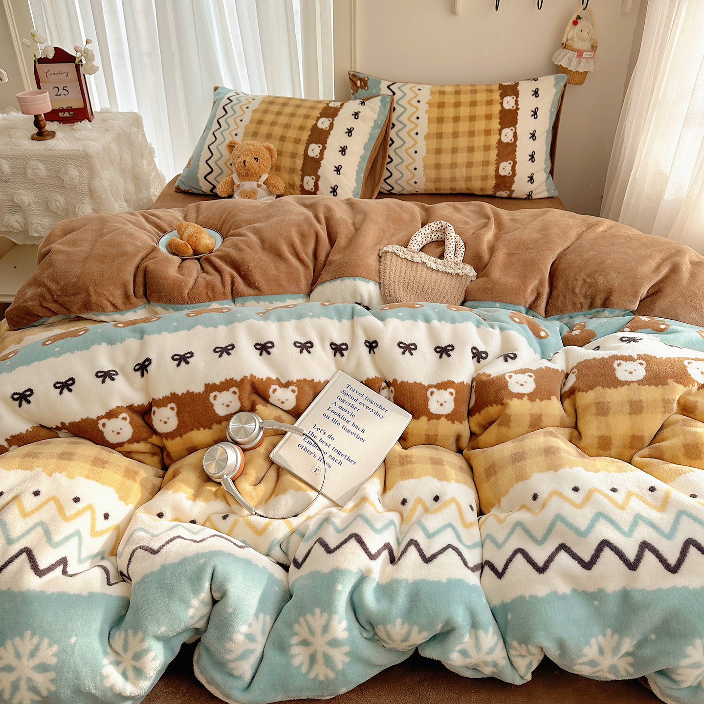ins费尔岛风可爱小熊秋冬舒适牛奶绒四件套保暖加厚珊瑚绒三件套