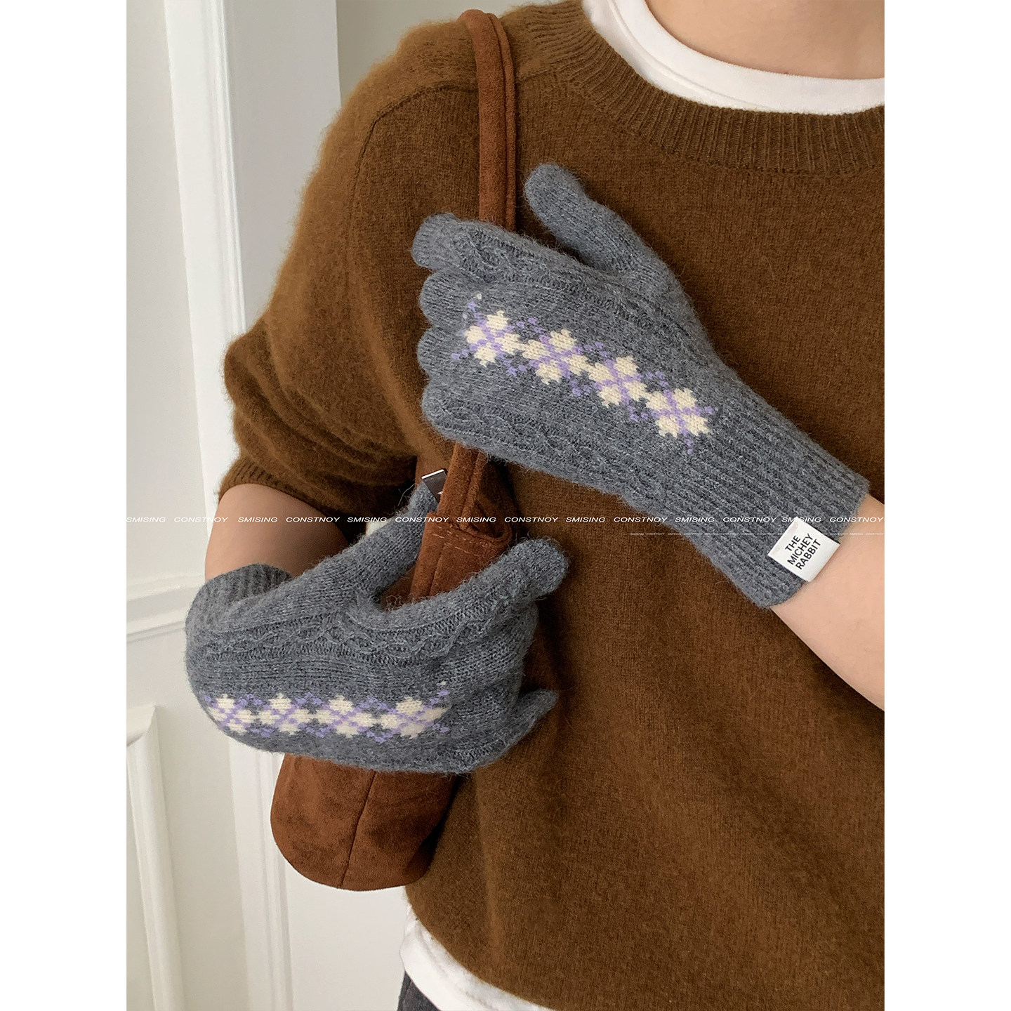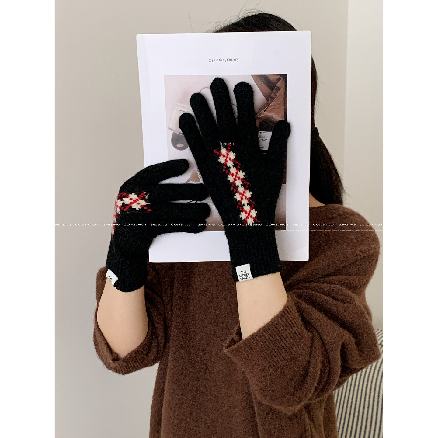 复古菱格羊毛针织手套女冬季加长手腕保暖防寒写字玩手机五指手套