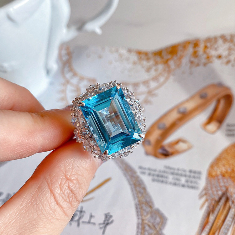 浪漫海蓝结婚钻戒少女学生硞石镶满钻公主方形简约甜美镀白金戒指