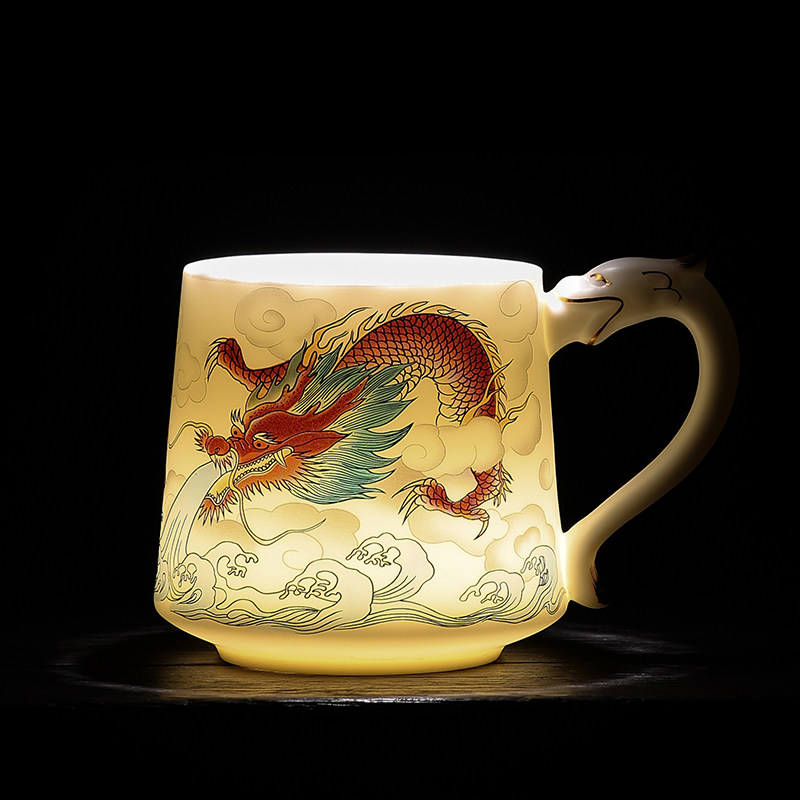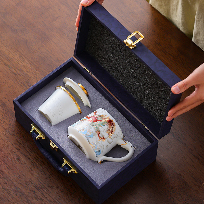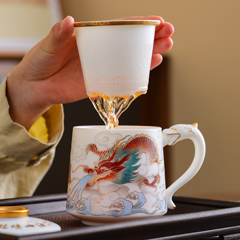 羊脂玉龙凤杯陶瓷带盖茶水分离水杯家用描金泡茶杯办公马克杯定制