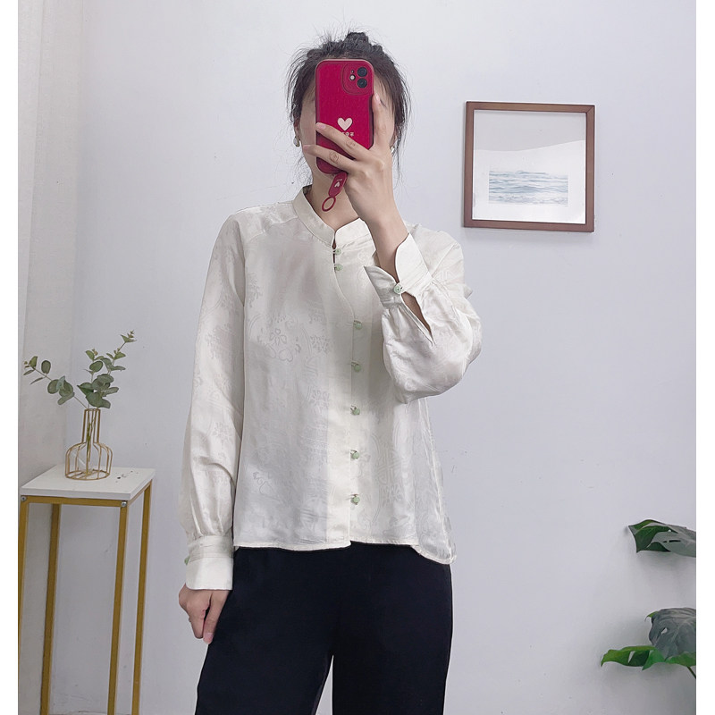 新中式国风雅韵70桑蚕丝提花真丝长袖衬衫女春夏季小立领长袖衬衣